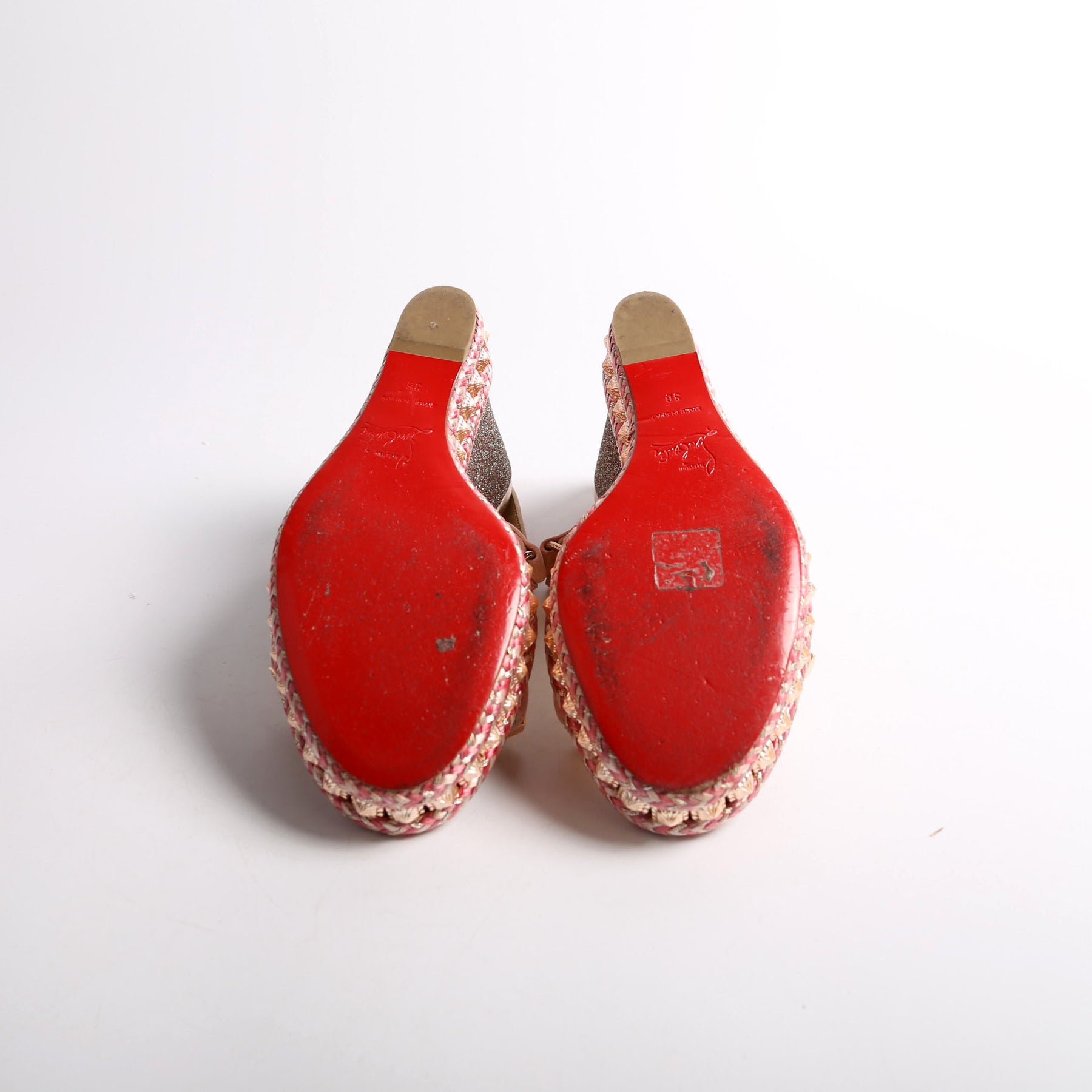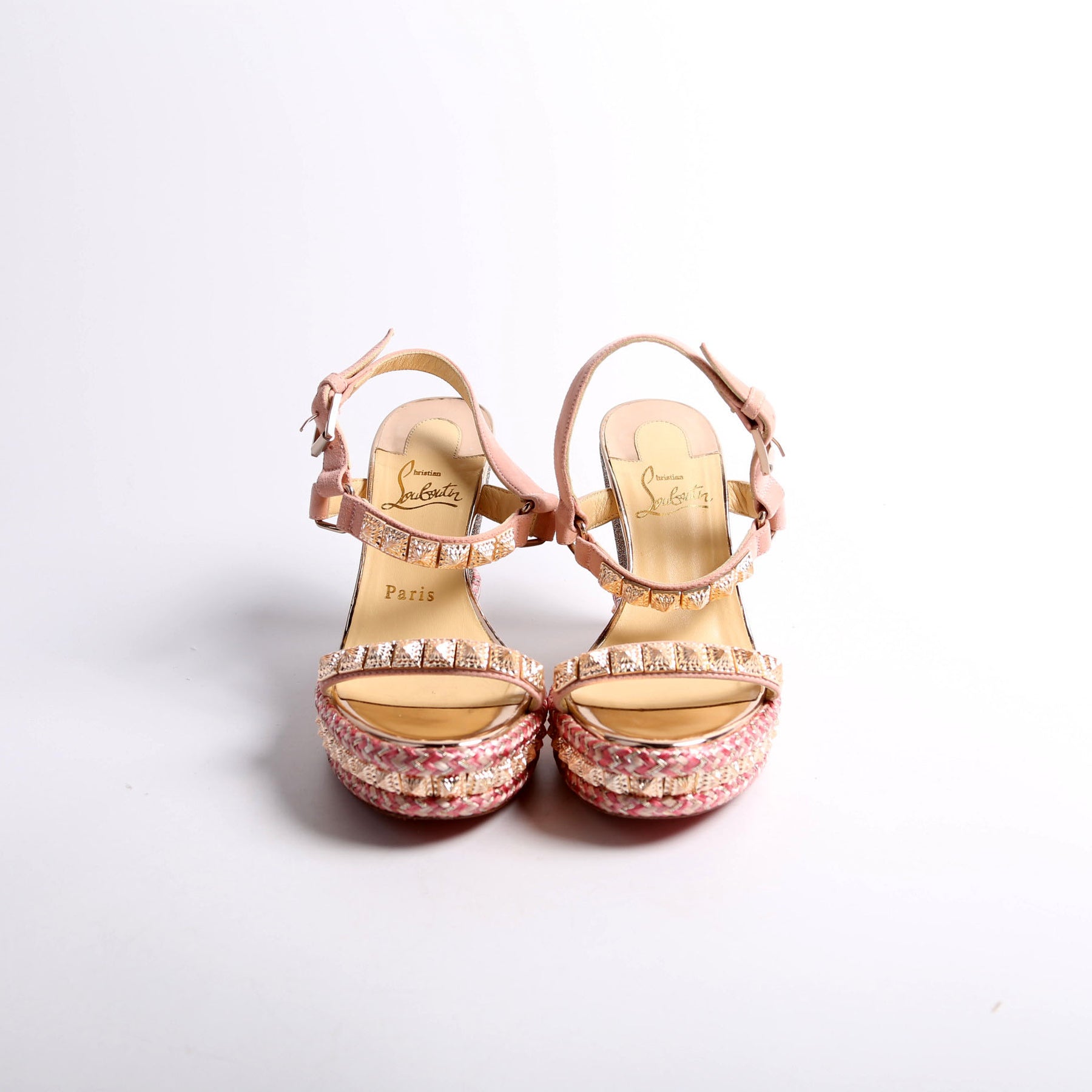 These pre-owned Christian Louboutin Pyraclou 100MM Sandal Wedges are guaranteed 100% authentic.