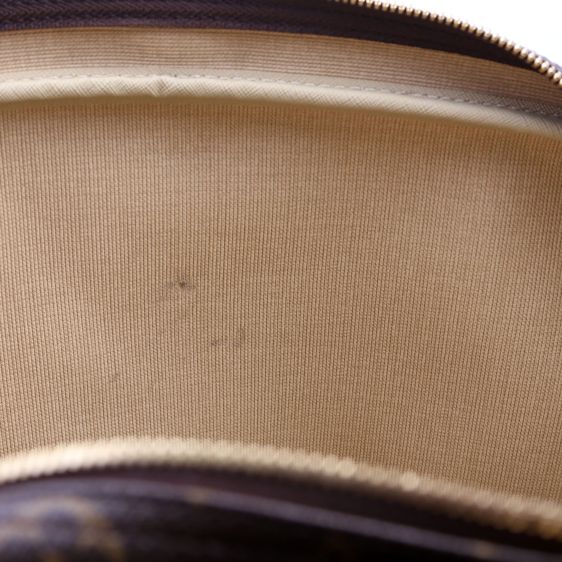 Interior: The interior shows light staining and marks throughout. The interior features two open pockets.