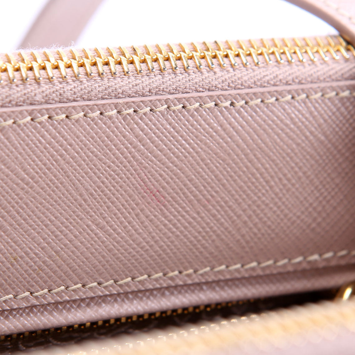Interior: The interior features some pen marks and one stain on top of the bag. The interior features three zippy pockets and one open pocket.