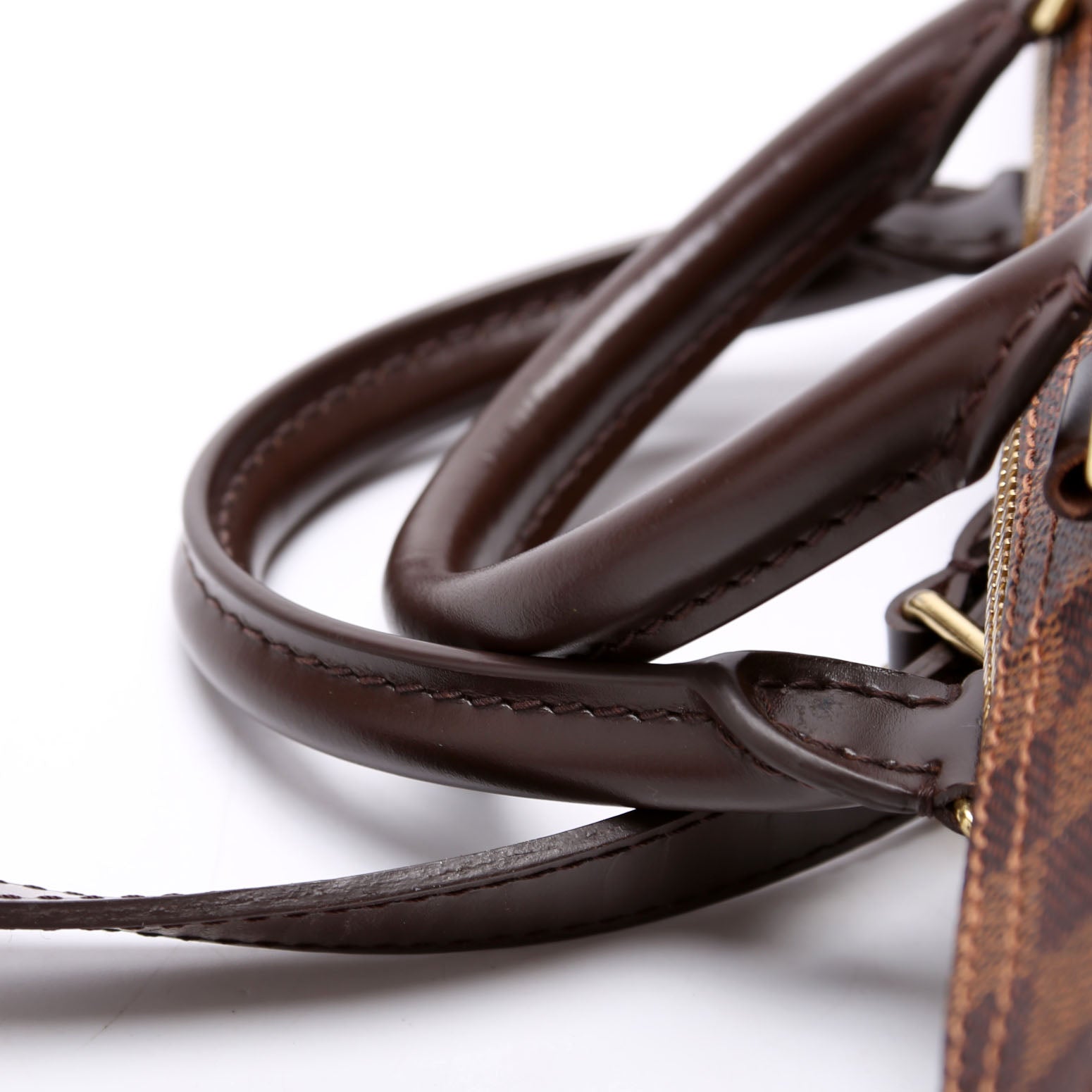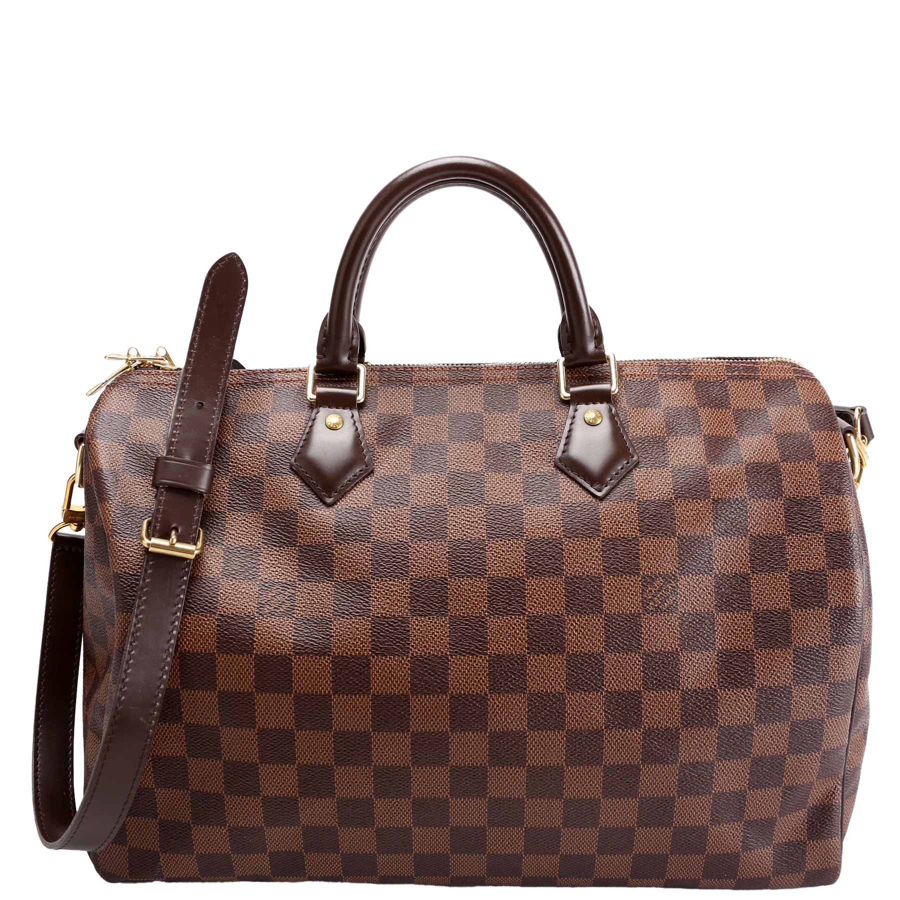 This pre-owned Louis Vuitton Speedy 35 Bandouliere is guaranteed 100% authentic. The exterior is in the classic Louis Vuitton Damier Ebene coated canvas.