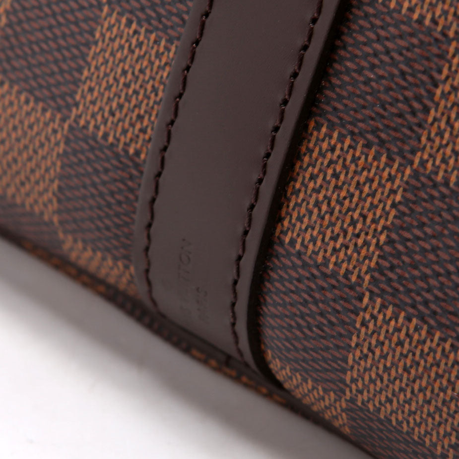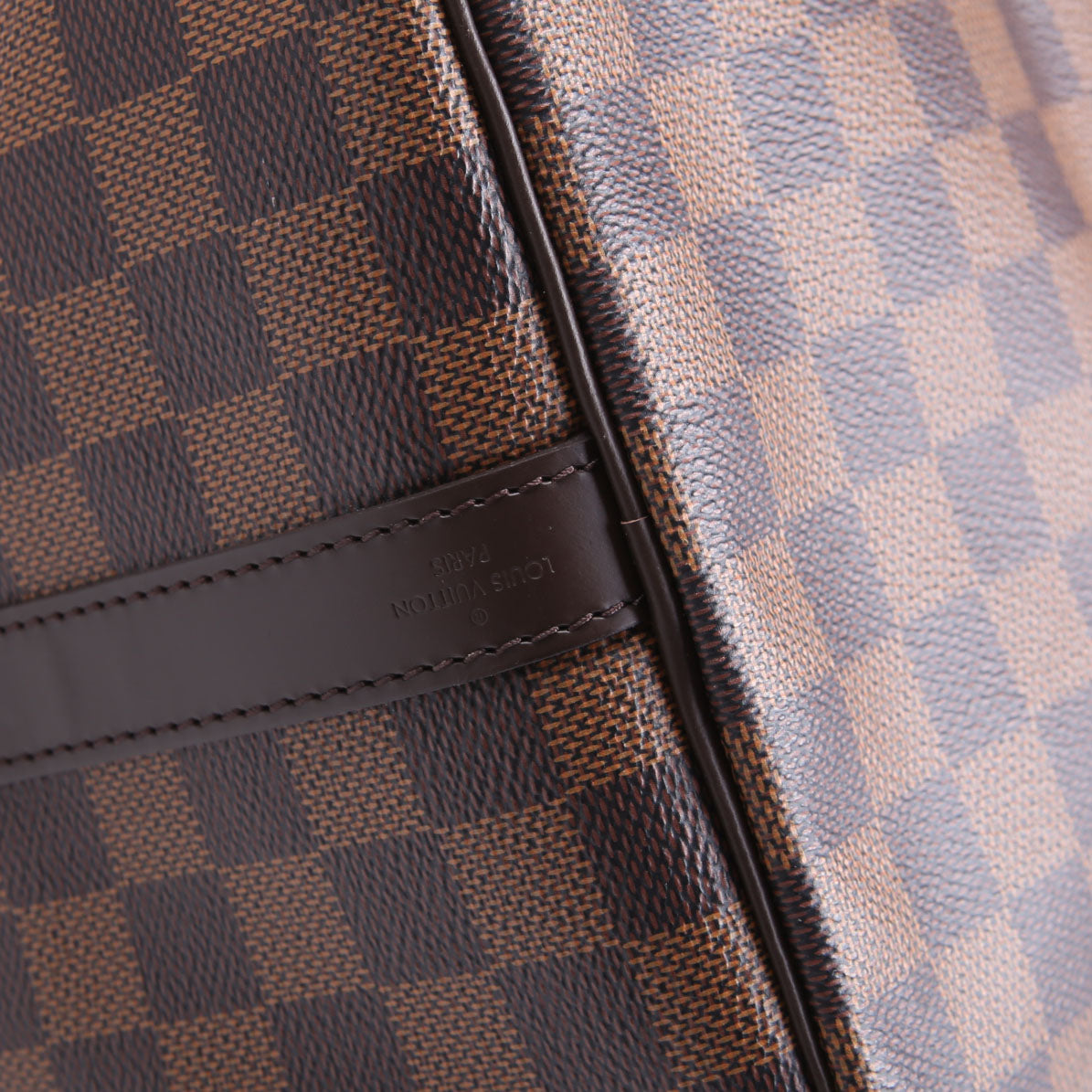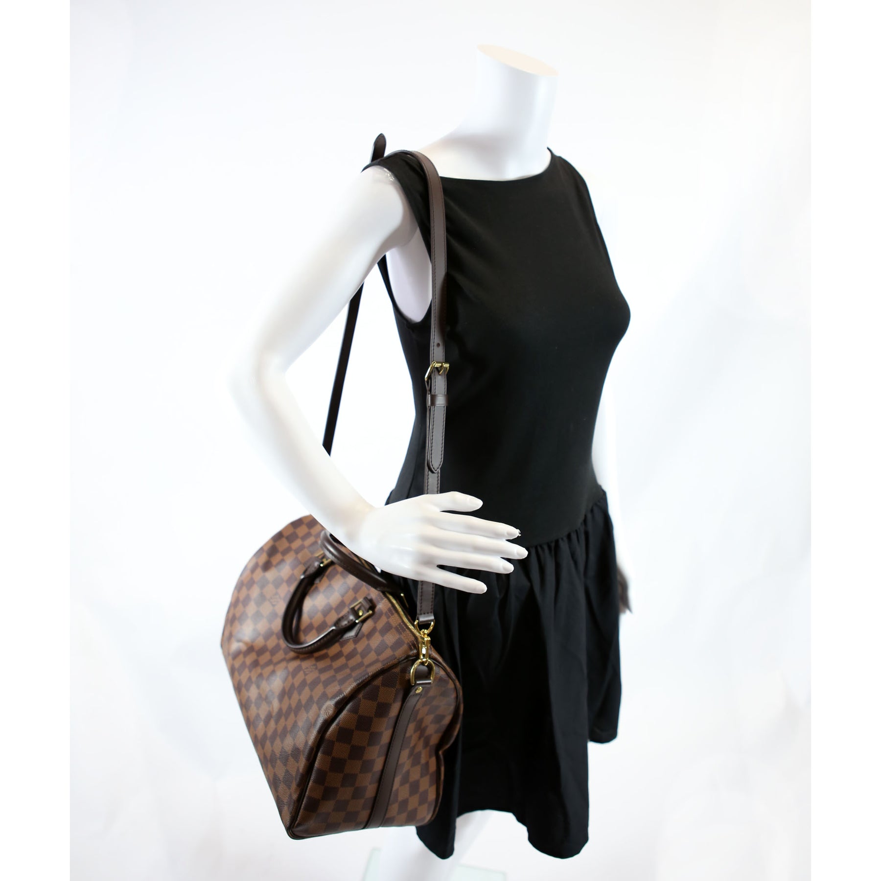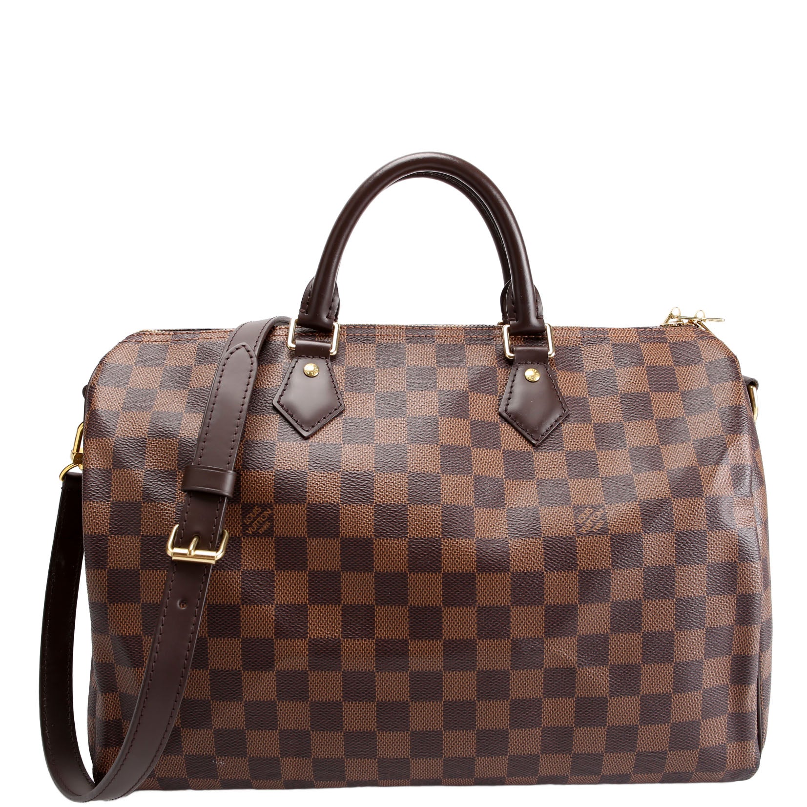 This pre-owned Louis Vuitton Speedy 35 is guaranteed 100% authentic. The exterior is in the classic Louis Vuitton Damier Ebene Coated Canvas.