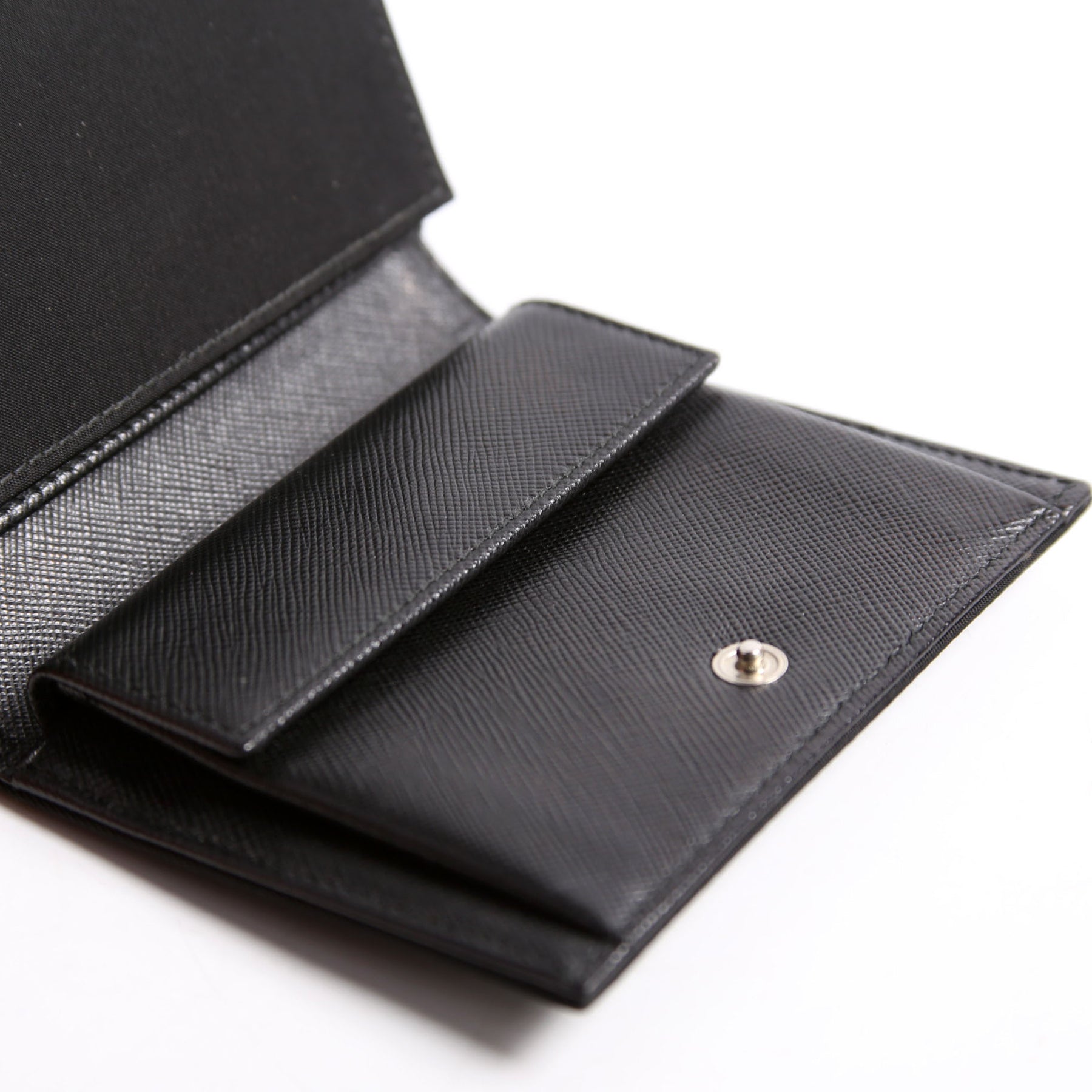 Interior: The interior is free of wear and features one bill slot, two open pockets, one snap closure pocket, and six card slots.
