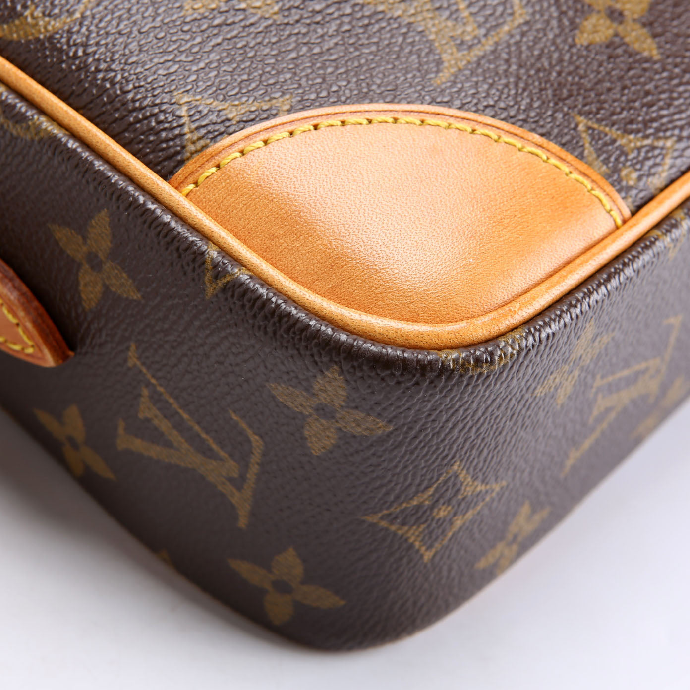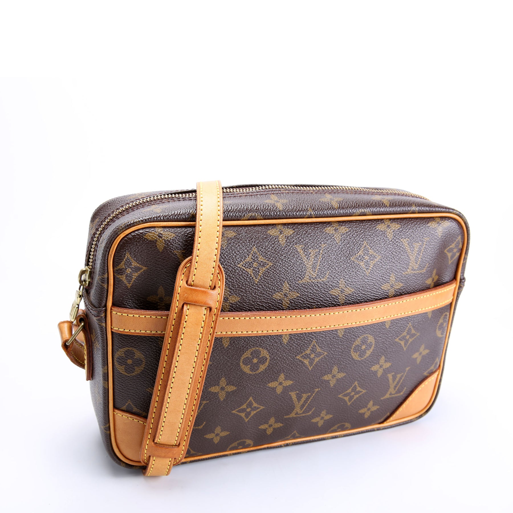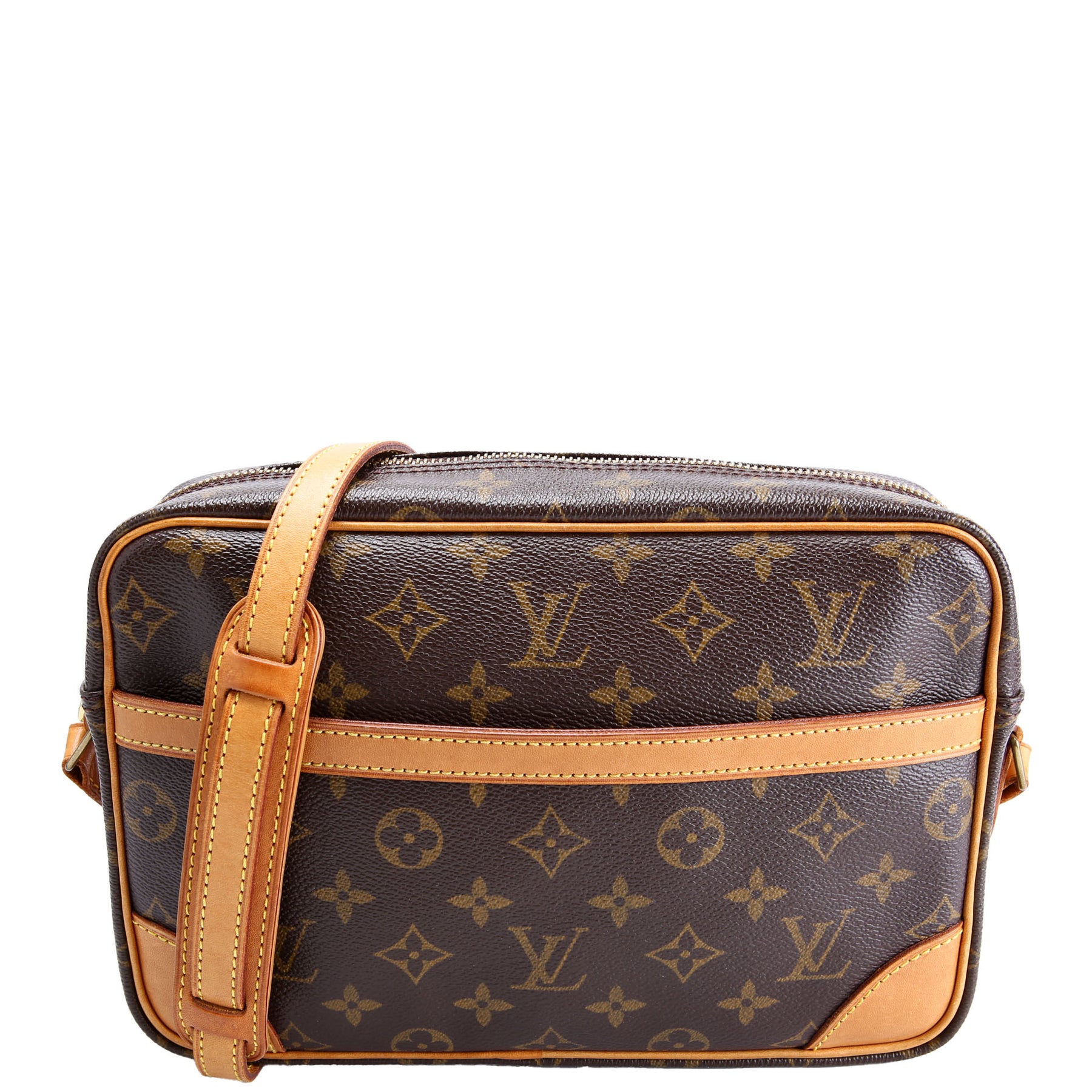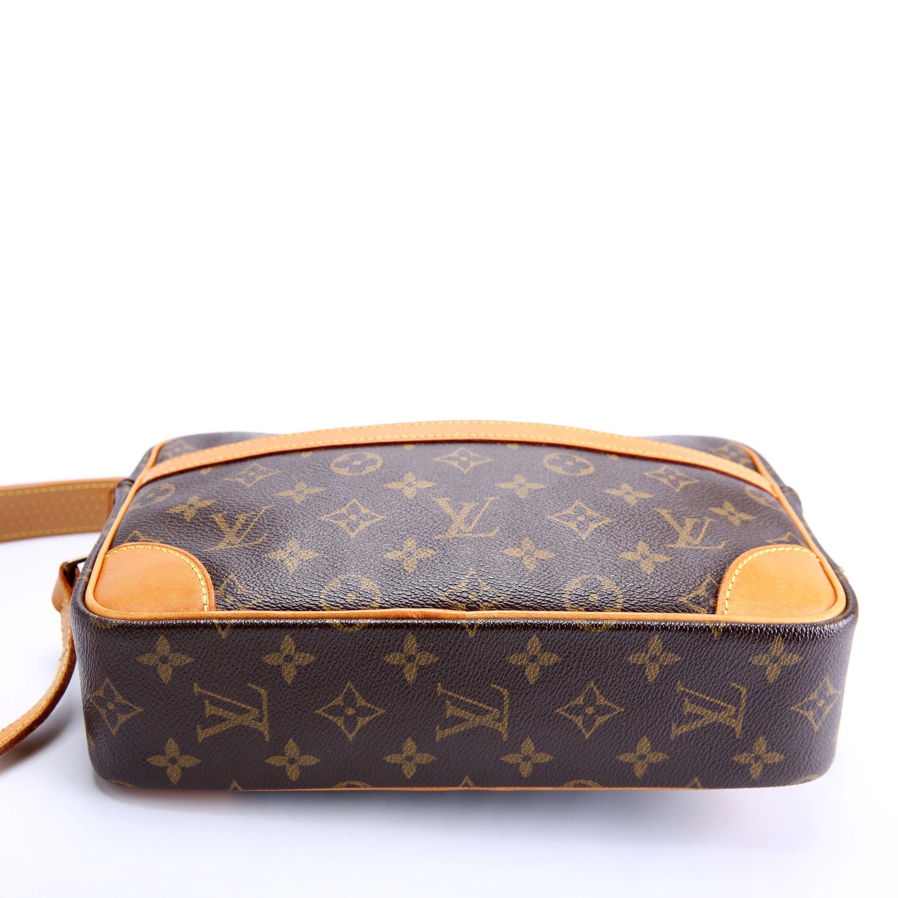 This pre-owned Louis Vuitton Trocadero 27 is guaranteed 100% authentic. The exterior is in the classic Louis Vuitton Monogram Coated Canvas