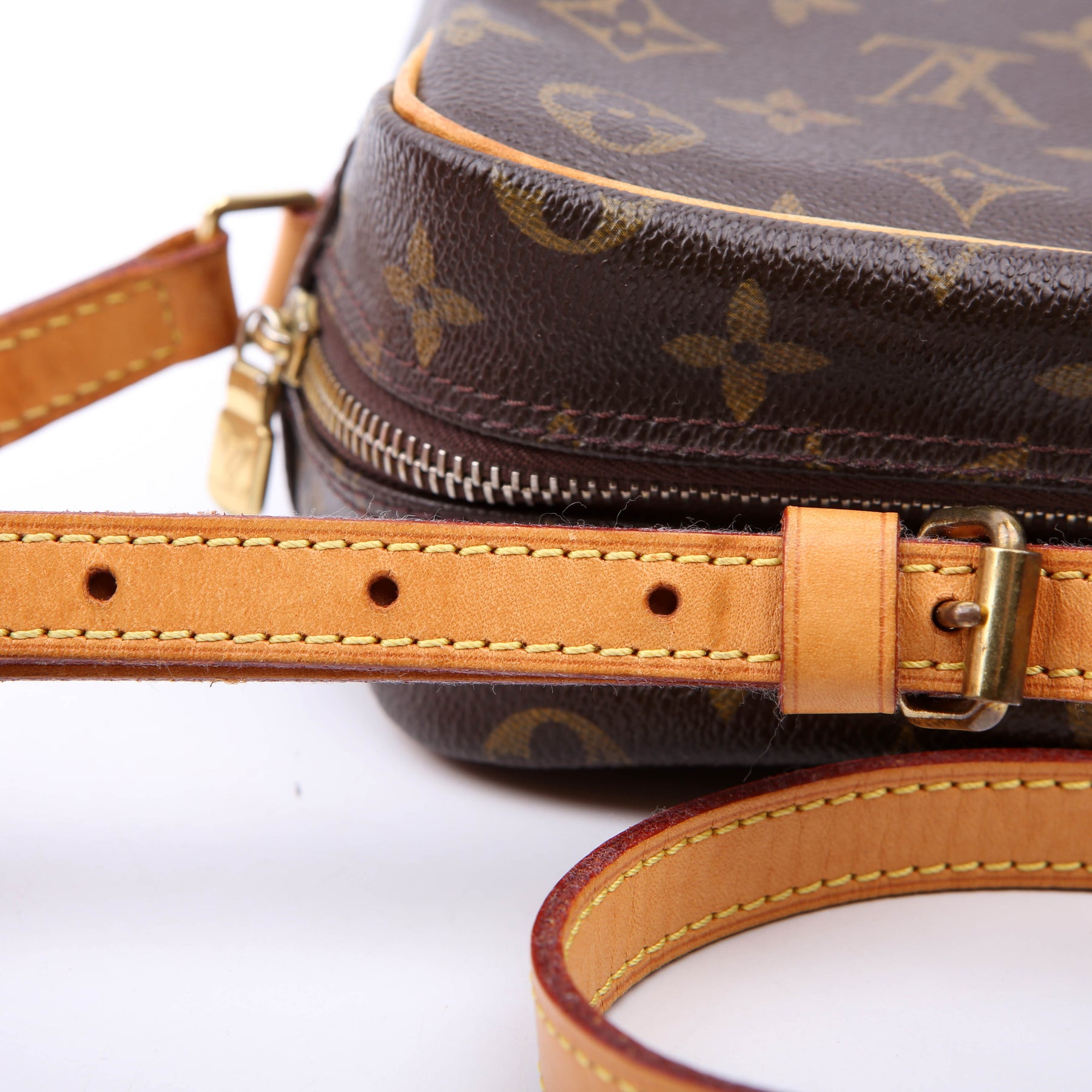 Strap: The shoulder strap shows minor wear and discoloration.