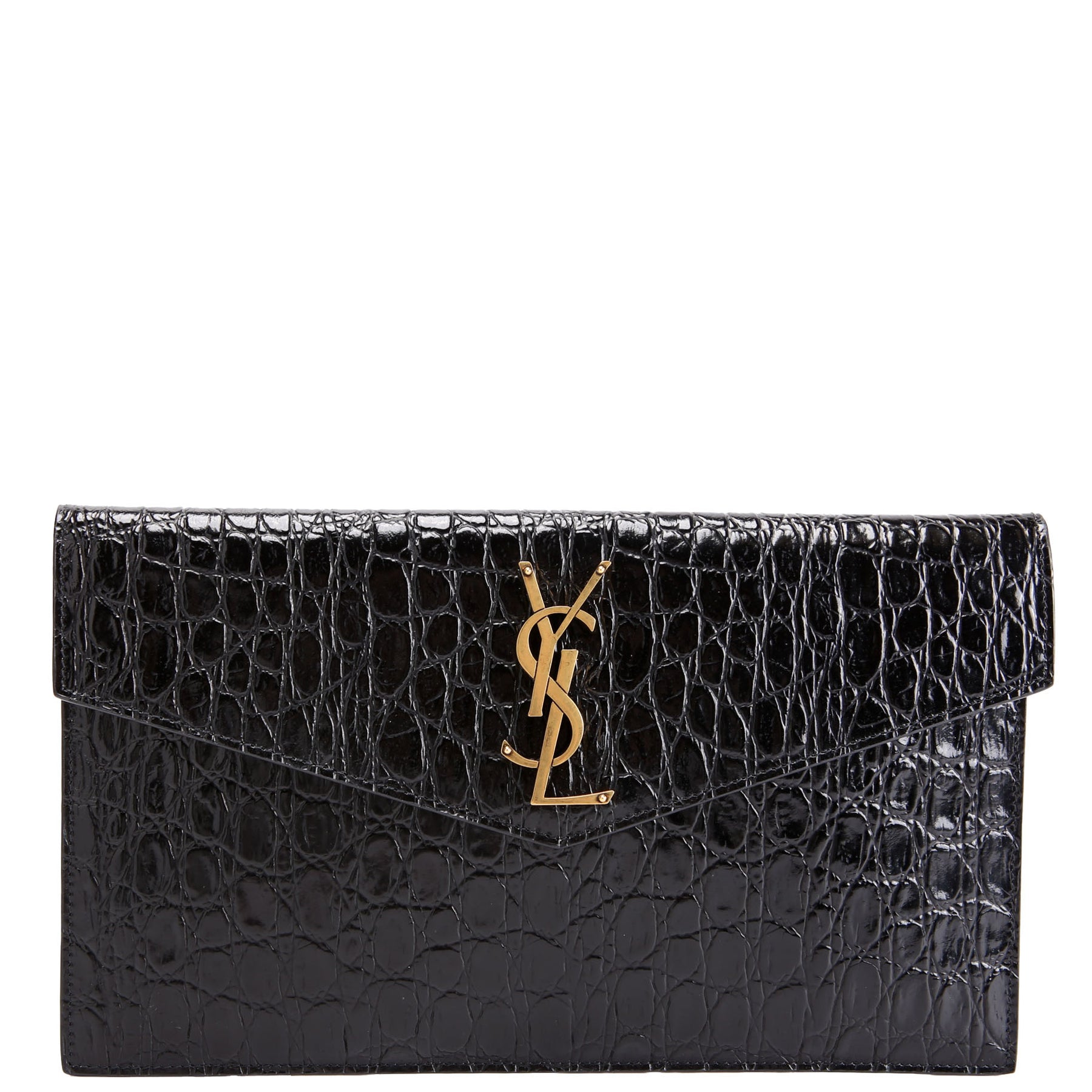 This pre-owned Saint Laurent Uptown Pouch Crocodile Embossed is guaranteed 100% authentic. The exterior is in the classic Saint Laurent Embossed leather.