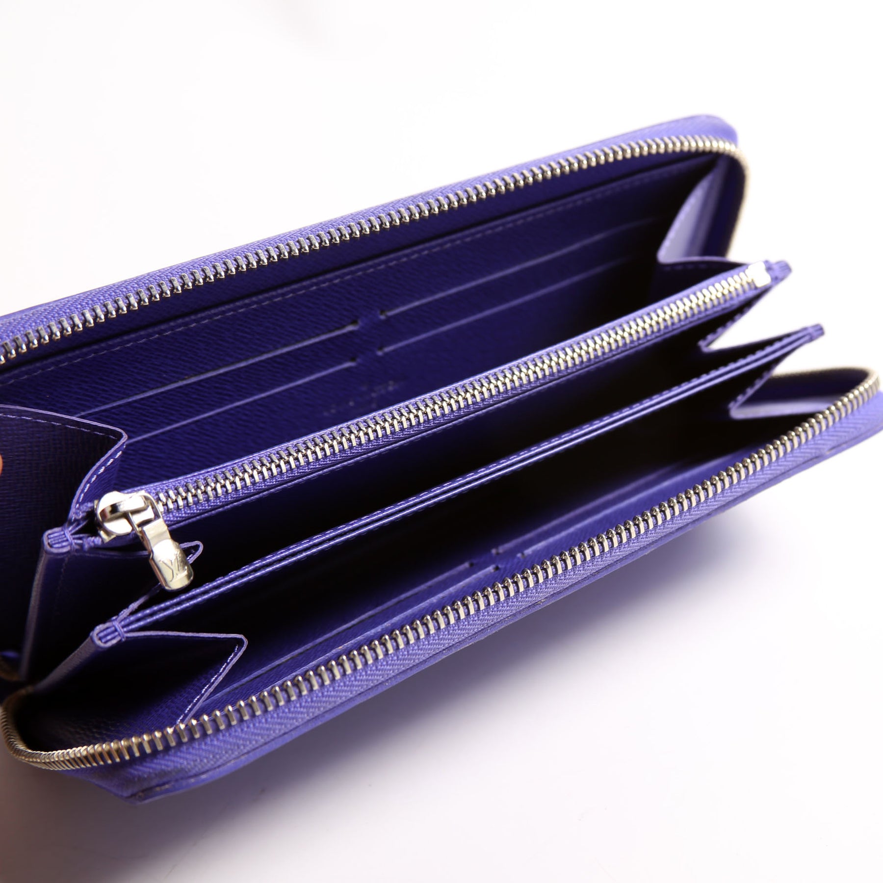 Interior: The interior shows light wear. The interior features one zip closure pocket, six open slip pockets, and eight card slots.