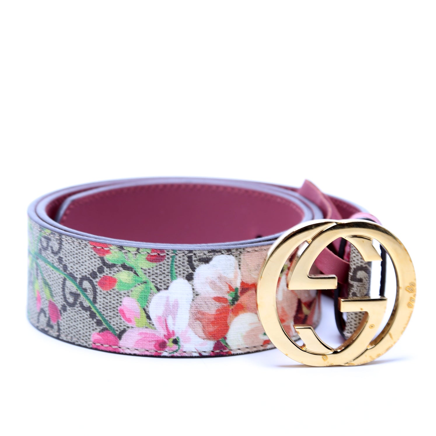 This pre-owned Gucci Interlocking GG Blooms Belt is guaranteed 100% authentic. The exterior is in the classic Gucci GG Supreme Blooms coated canvas.