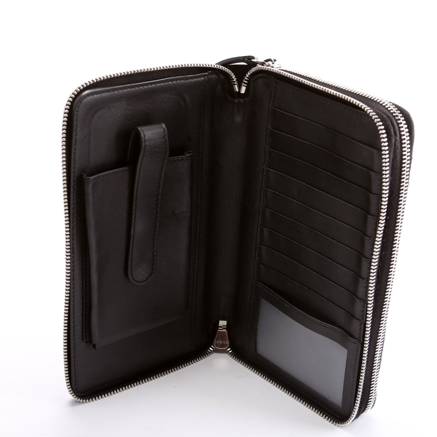 Interior: The interior has light scuffs throughout. It features two zip closure section with twelve bill slots and four pockets, and one snap closure section with ten card slots.