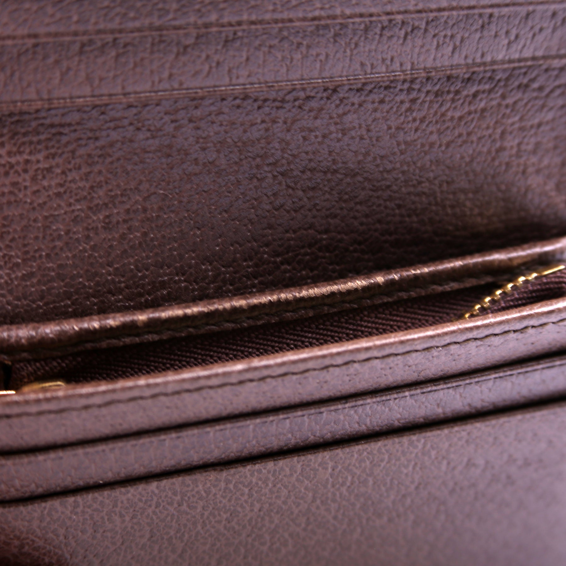 Interior: The interior shows light wear throughout. The interior features six card slots, one bill slot, and one zip closure coin pouch.