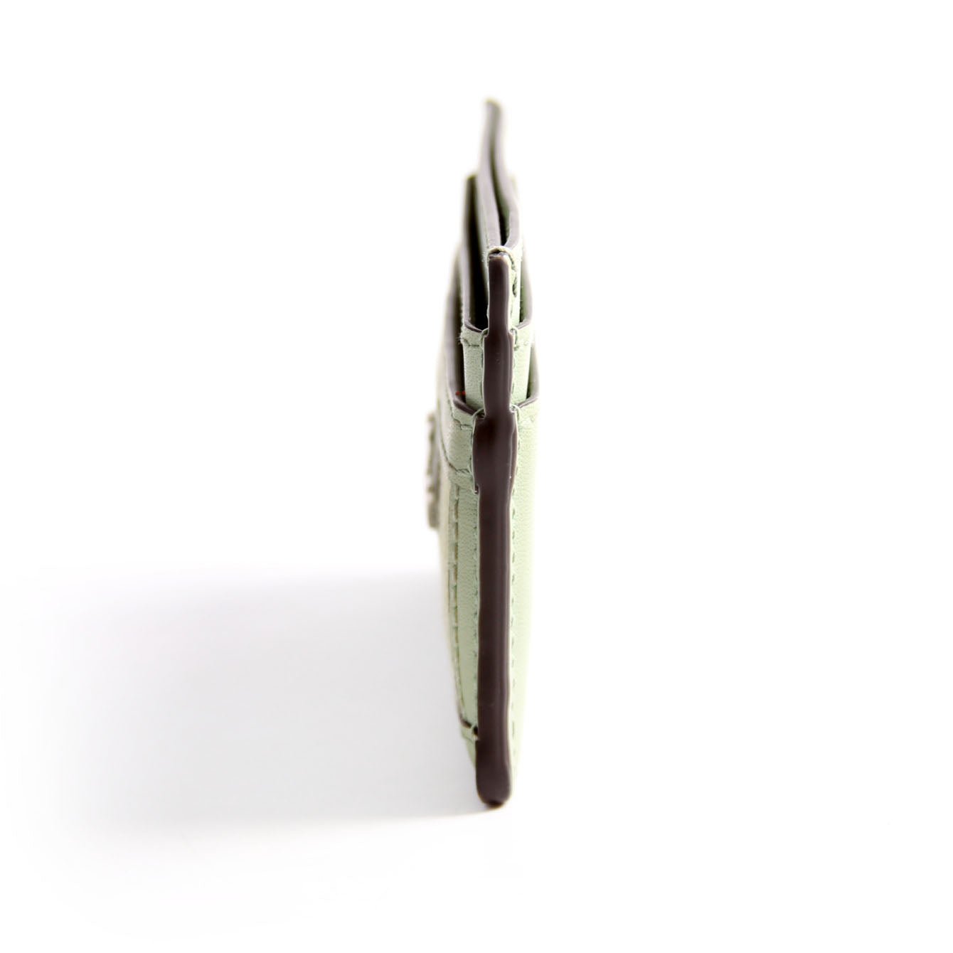 Exterior: The exterior coated canvas features minor stains. The exterior features five card slots.