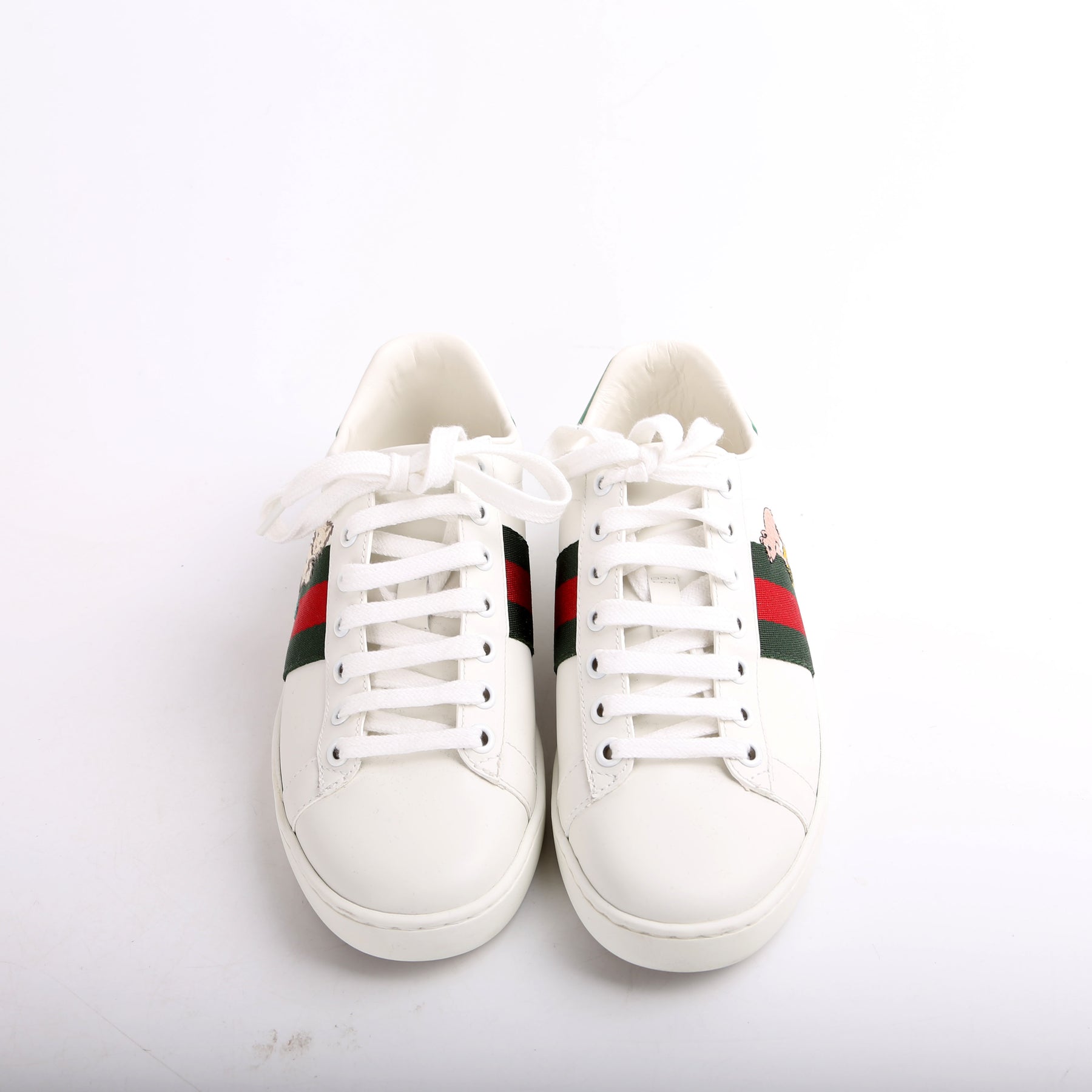 These pre-owned Gucci Ace Web Pig/Kitten Sneakers are guaranteed 100% authentic.
