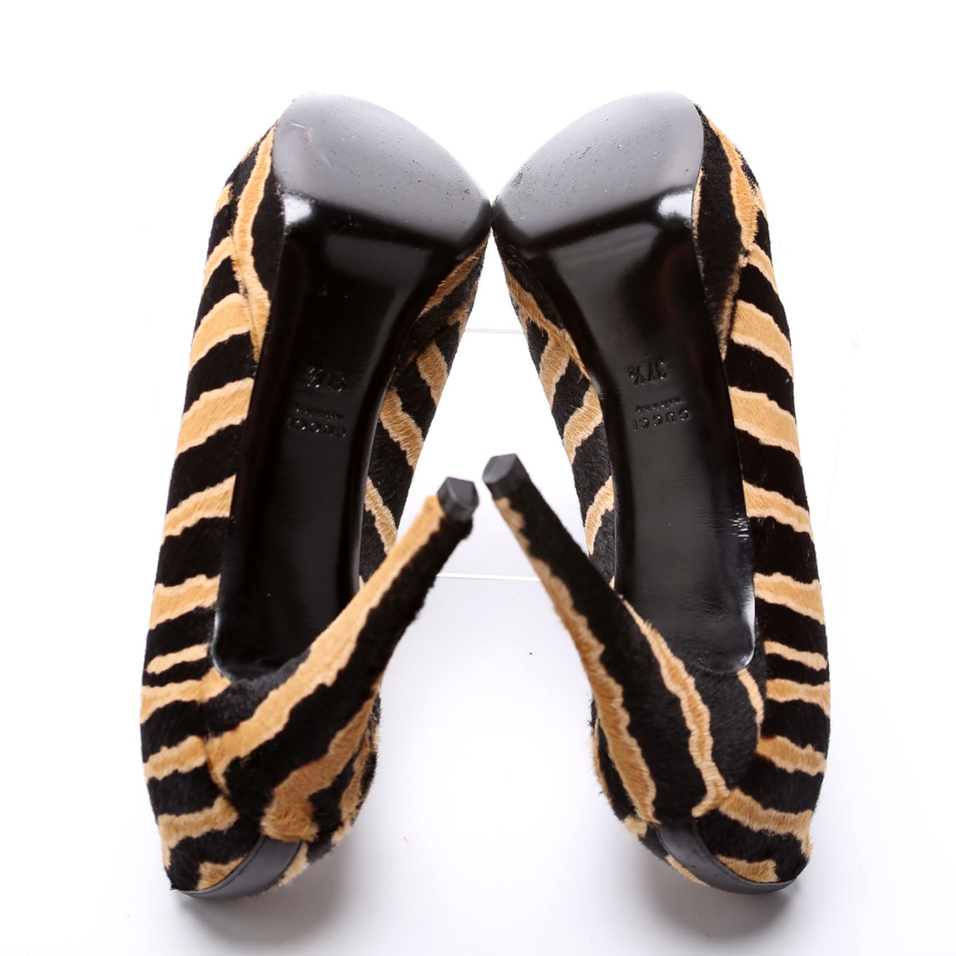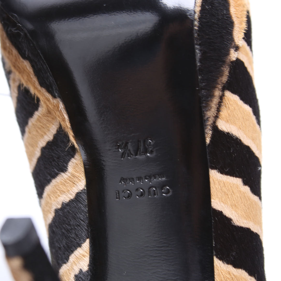 These pre-owned Gucci Betty Calfskin Hair Open Toe Pumps are guaranteed 100% authentic.
