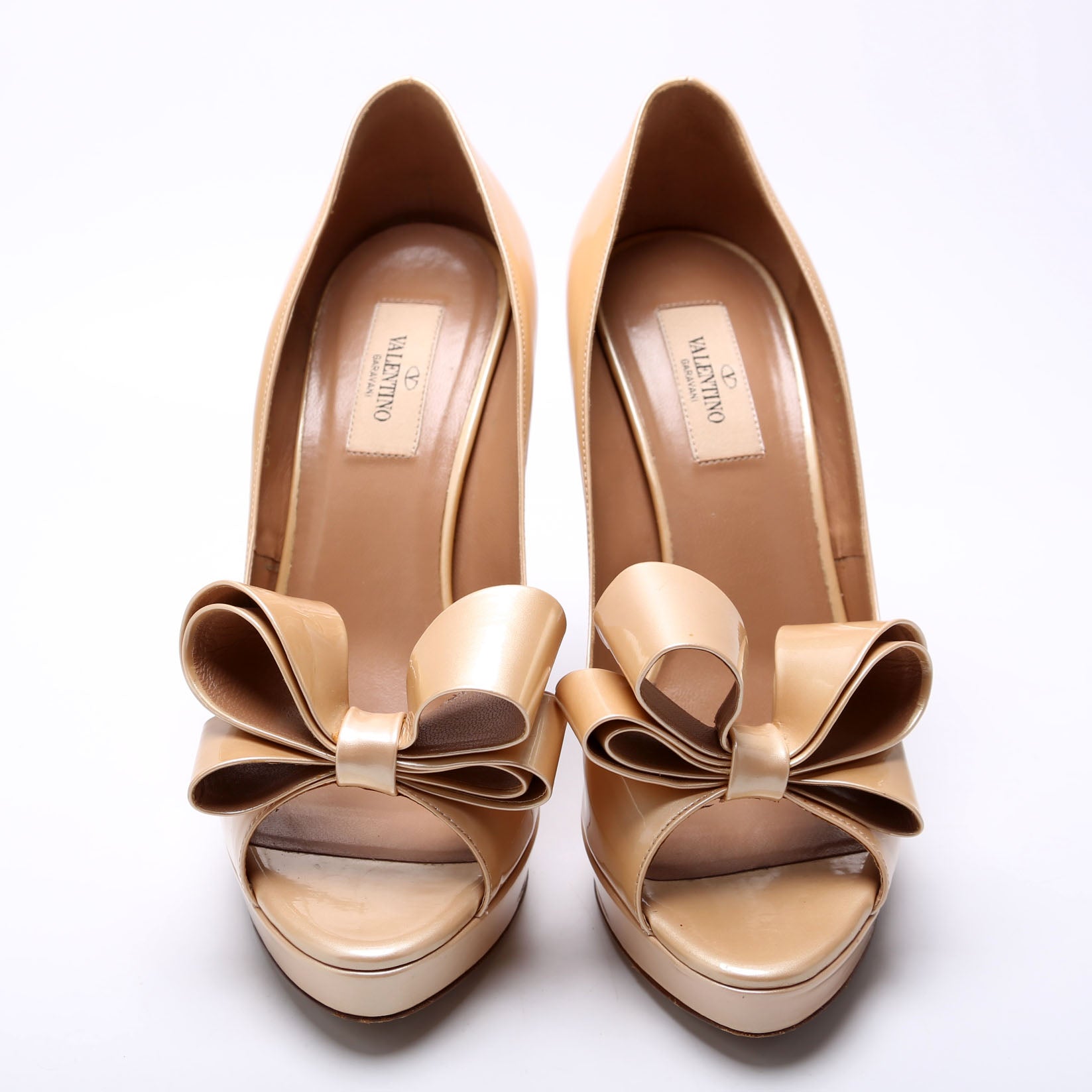 These pre-owned Valentino Bow Peep Toe Patent Pumps are guaranteed 100% authentic.