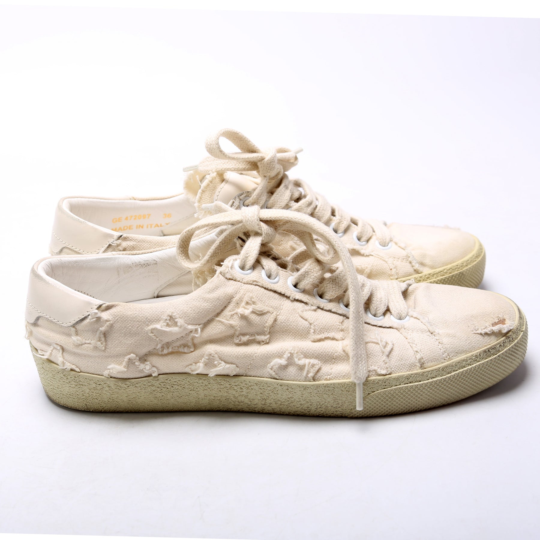 These pre-owned Saint Laurent Canvas Lace Up Distressed Sneakers Sneakers are guaranteed 100% authentic.