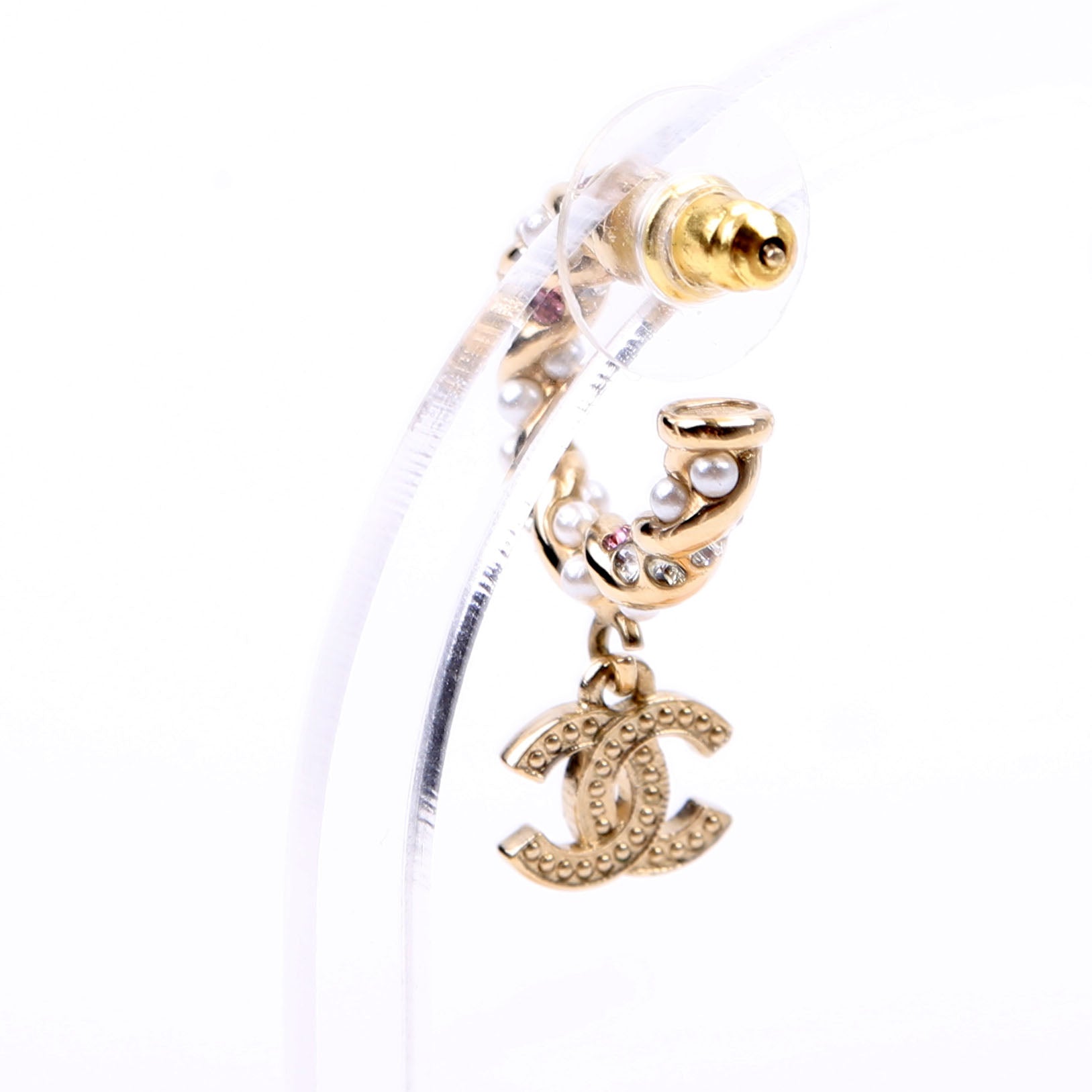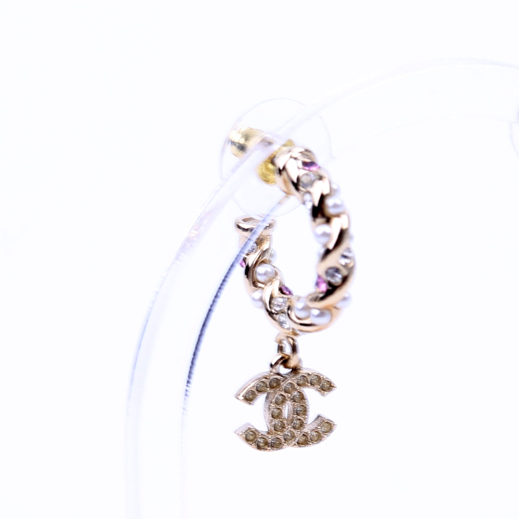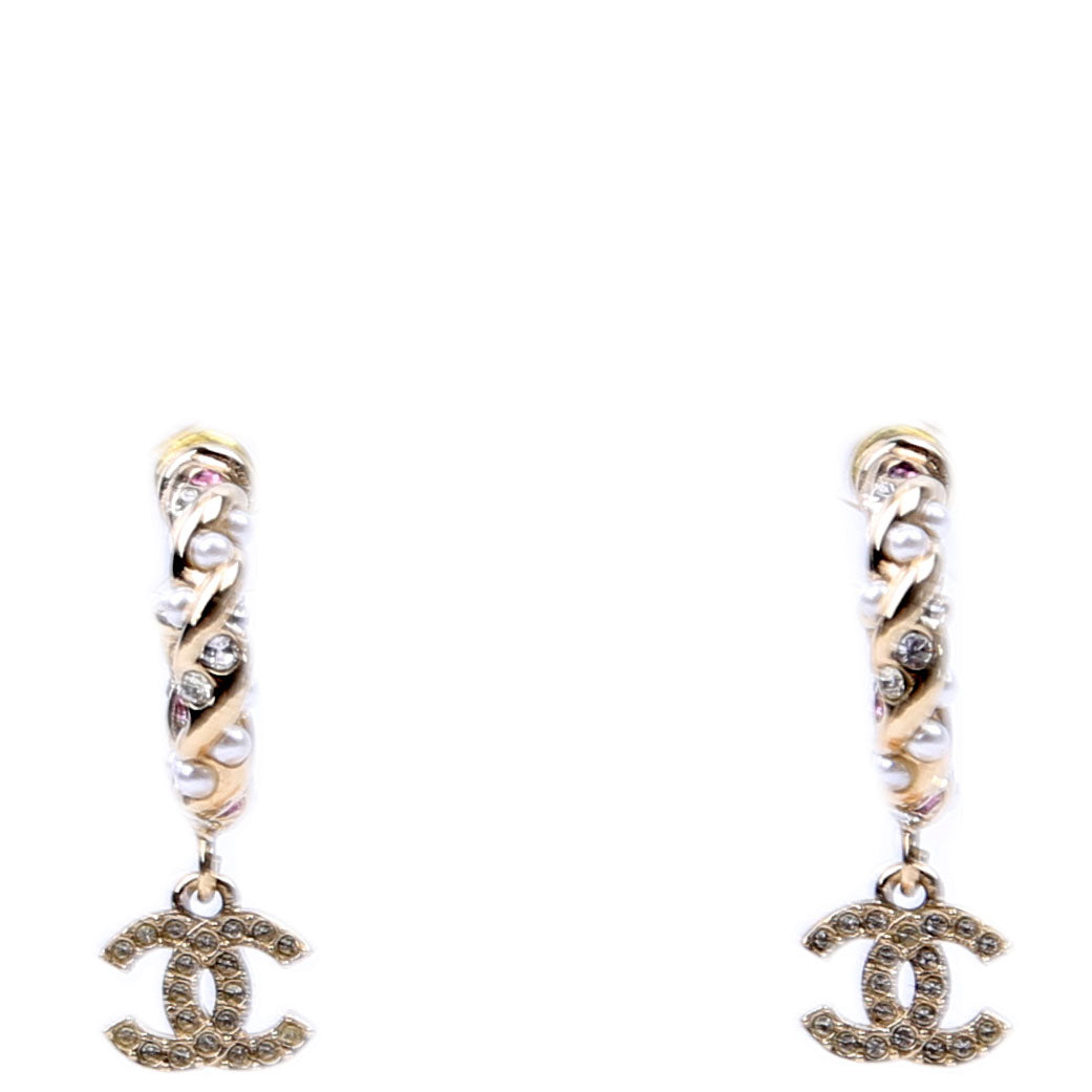 These pre-owned Chanel CC Crystal/Pearl Rope Small Hoop Earrings are guaranteed 100% authentic.