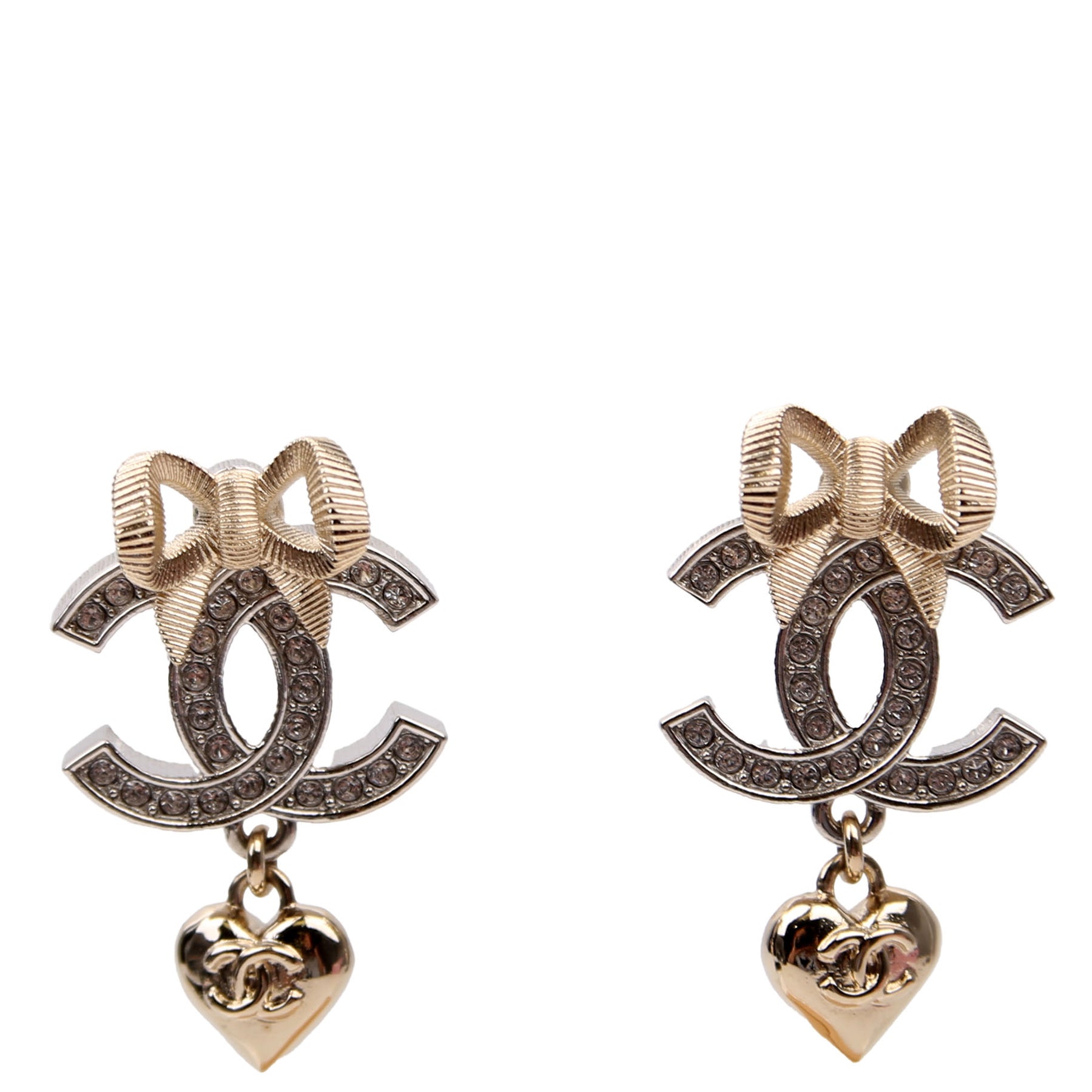 These pre-owned Chanel CC Strass Bow Heart Drop Stud Earrings are guaranteed 100% authentic.