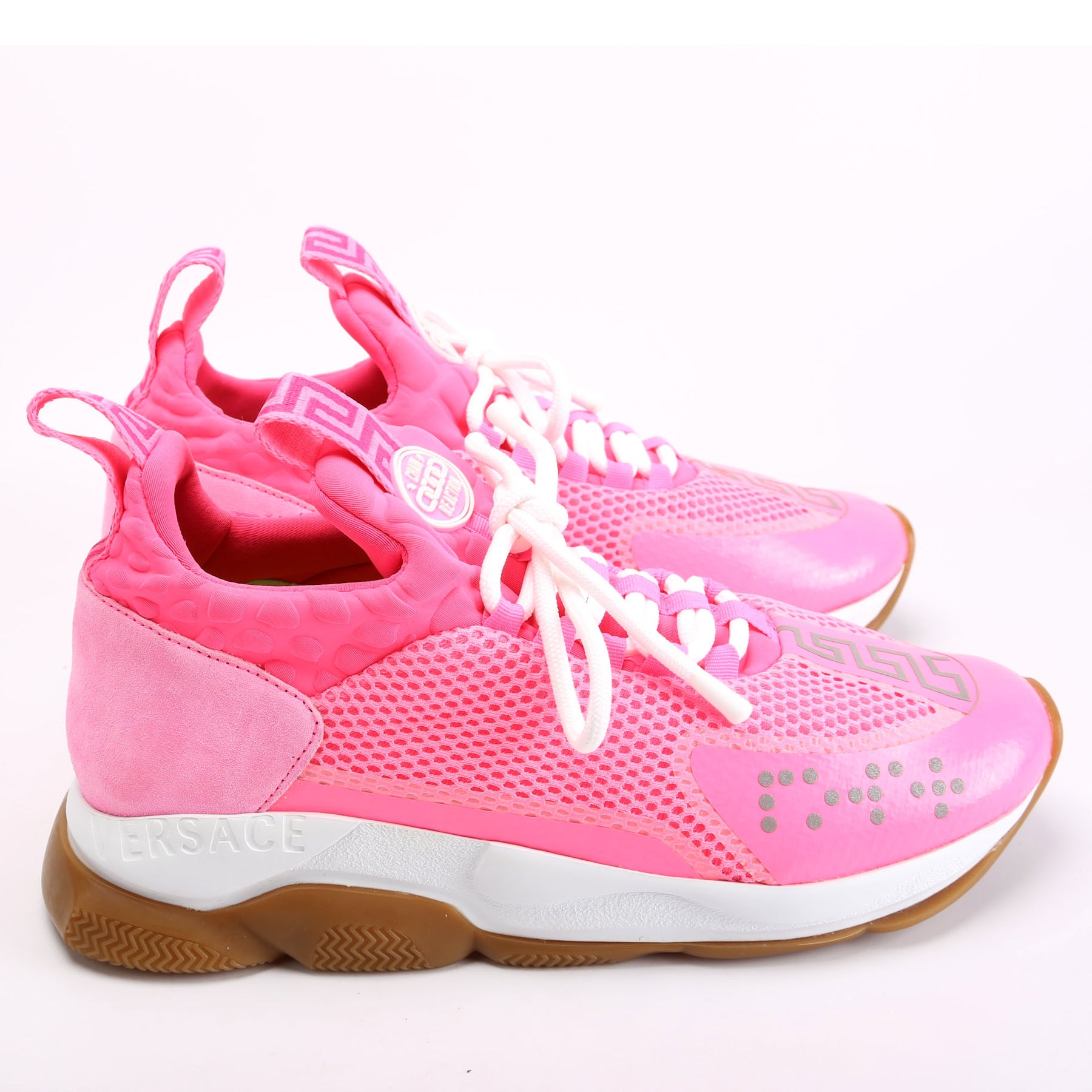 These pre-owned Versace Chain Reaction Sneakers are guaranteed 100% authentic.