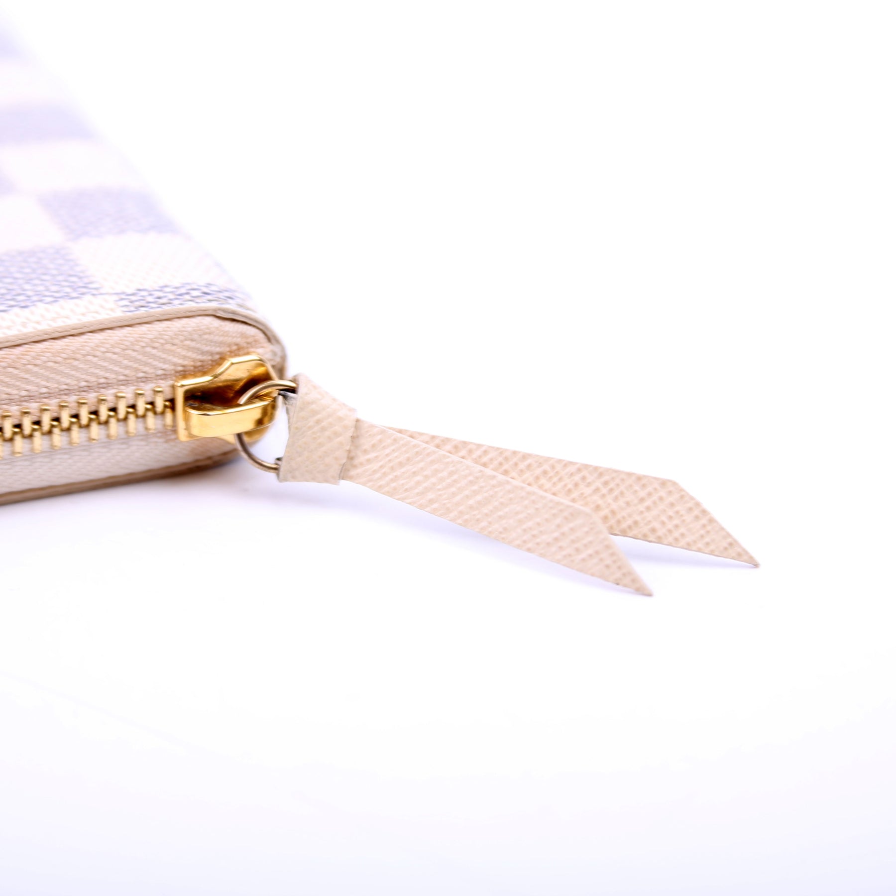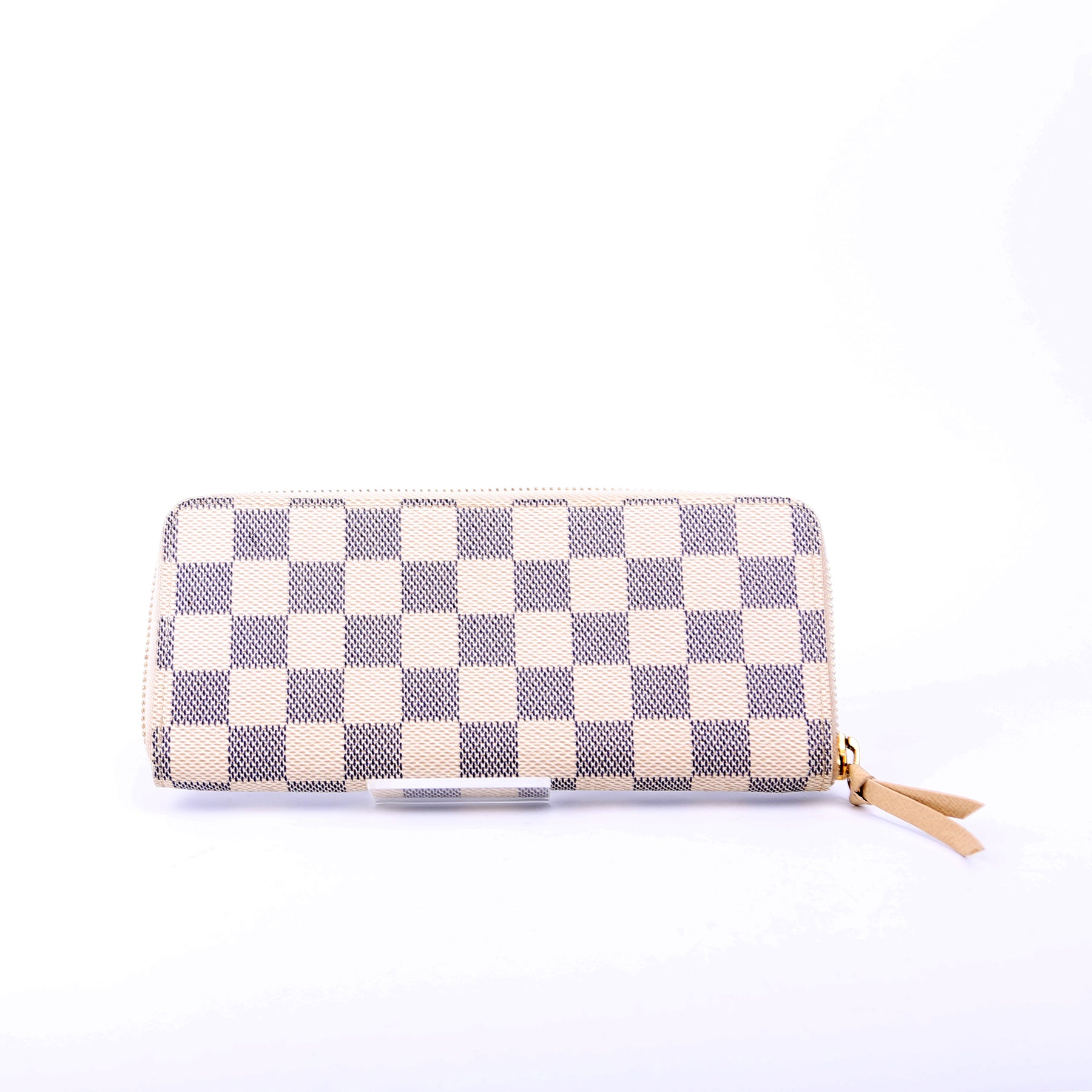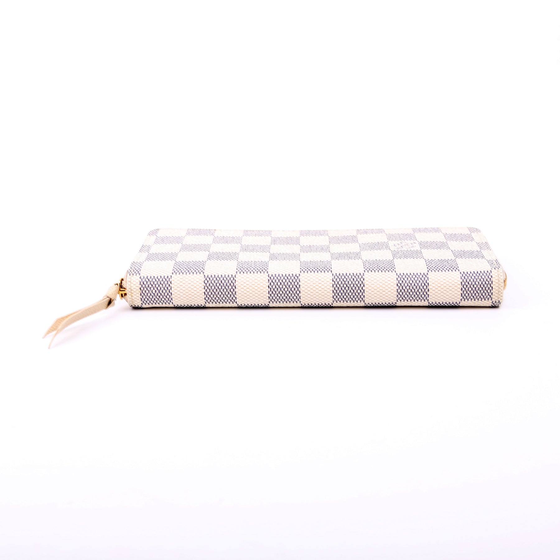 This pre-owned Louis Vuitton Clemence Wallet is guaranteed 100% authentic. The exterior is in the classic Louis Vuitton Damier Azur coated canvas.