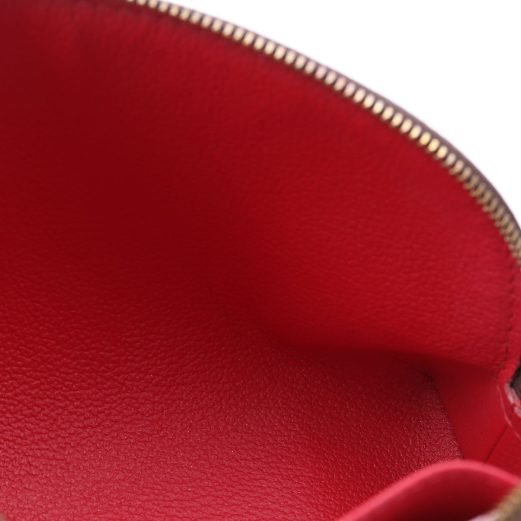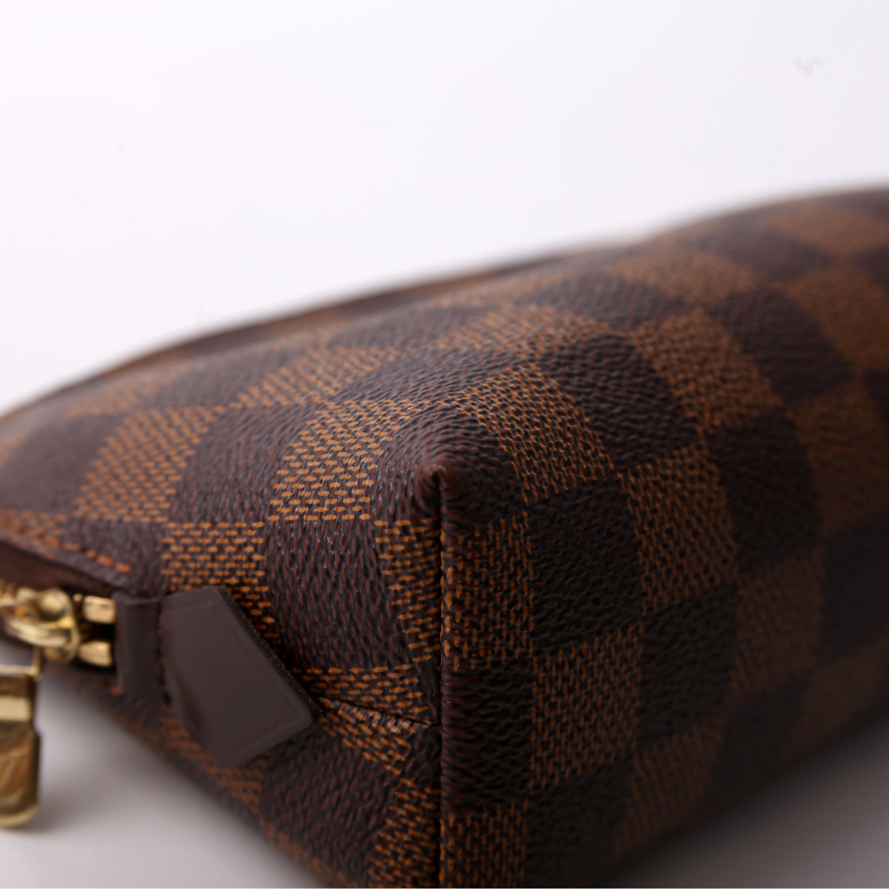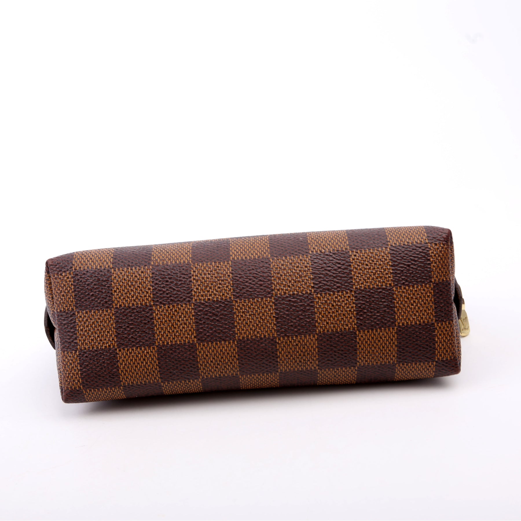 This pre-owned Louis Vuitton Cosmetic Pouch PM is guaranteed 100% authentic. The exterior is in the classic Louis Vuitton Damier Ebene coated canvas.