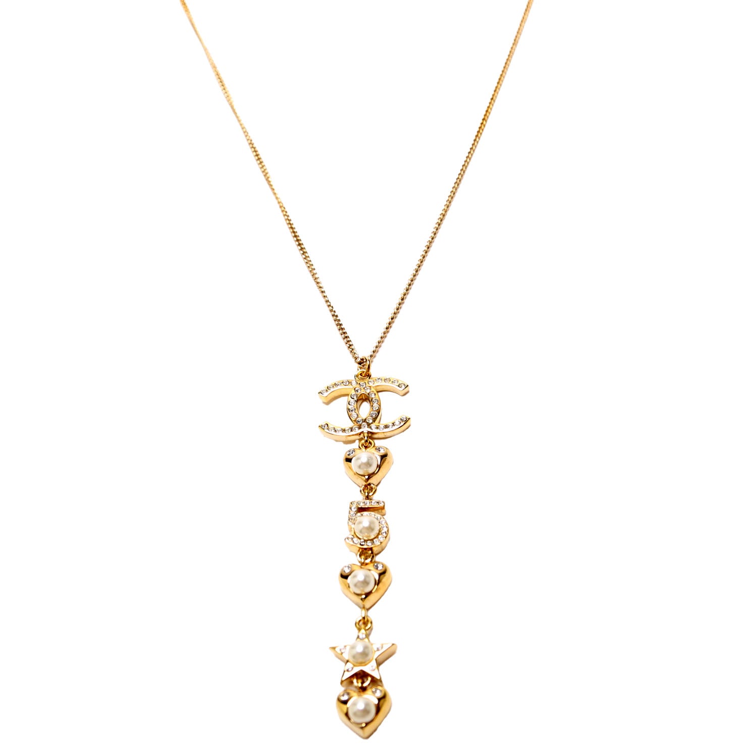 This pre-owned Chanel Crystal CC Charms Drop Necklace is guaranteed 100% authentic.