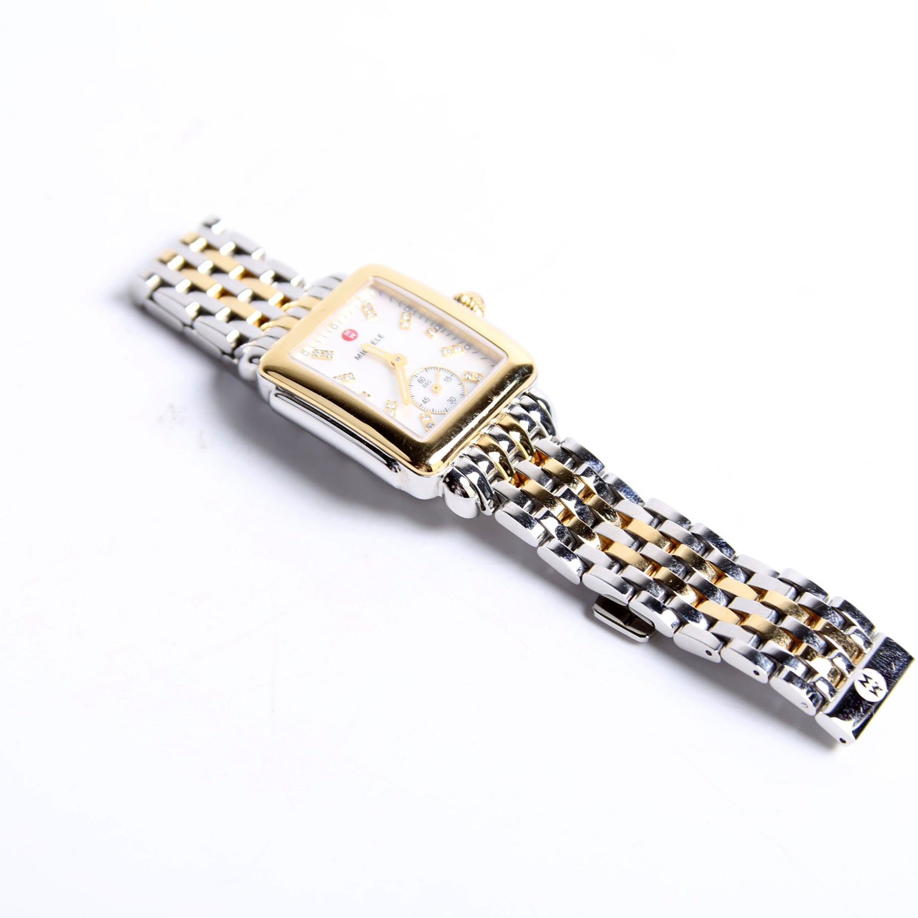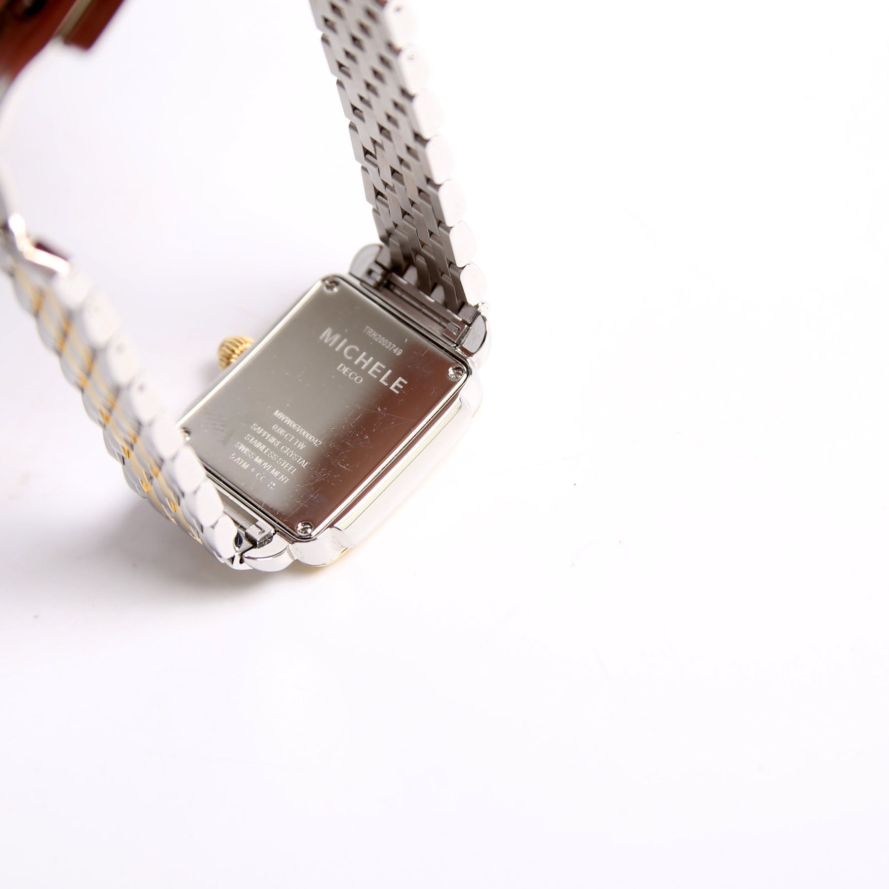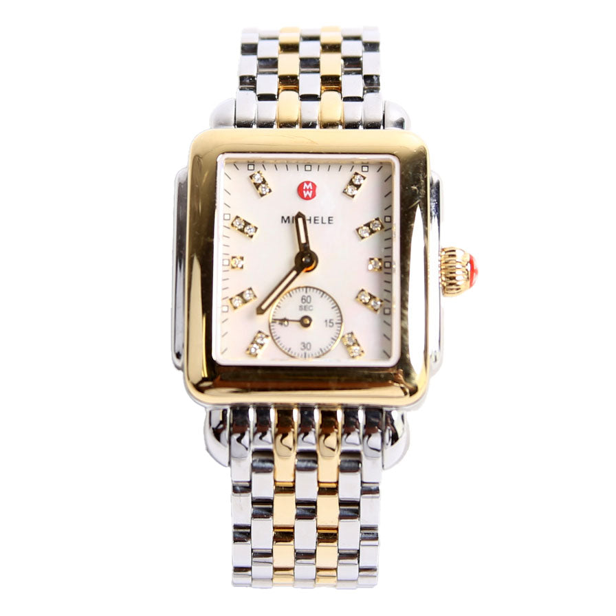 This pre-owned Michele Deco Mid Two-Tone 18K Plated W/.08 CW Watch is guaranteed 100% authentic.