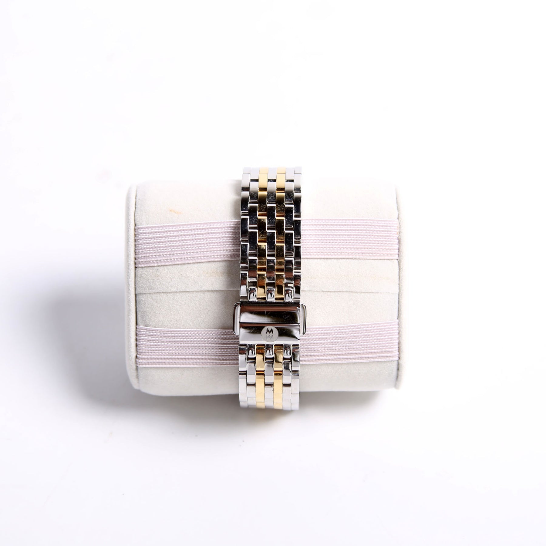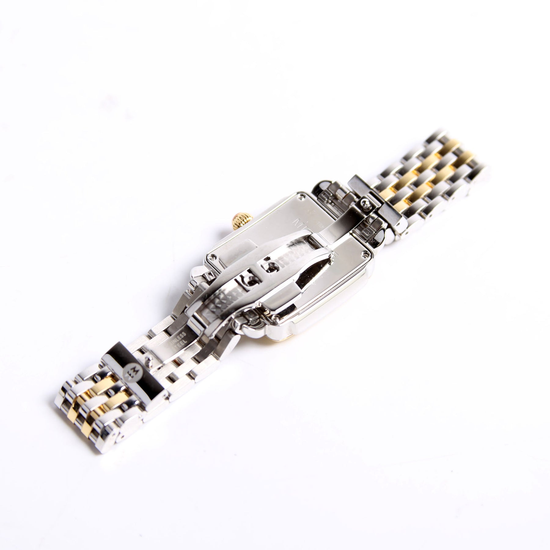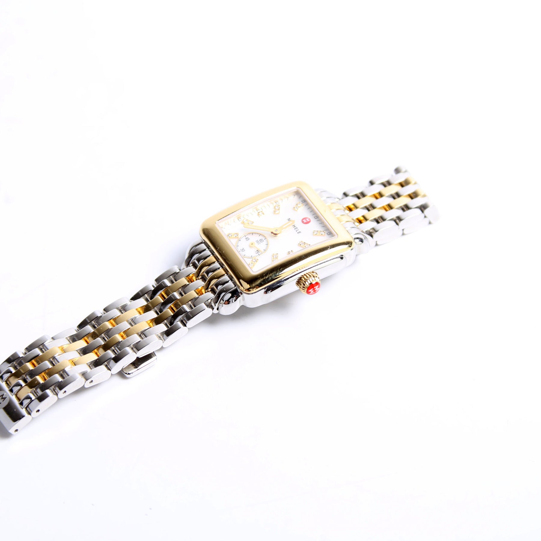 This pre-owned Michele Deco Mid Two-Tone 18K Plated W/.08 CW Watch is guaranteed 100% authentic.