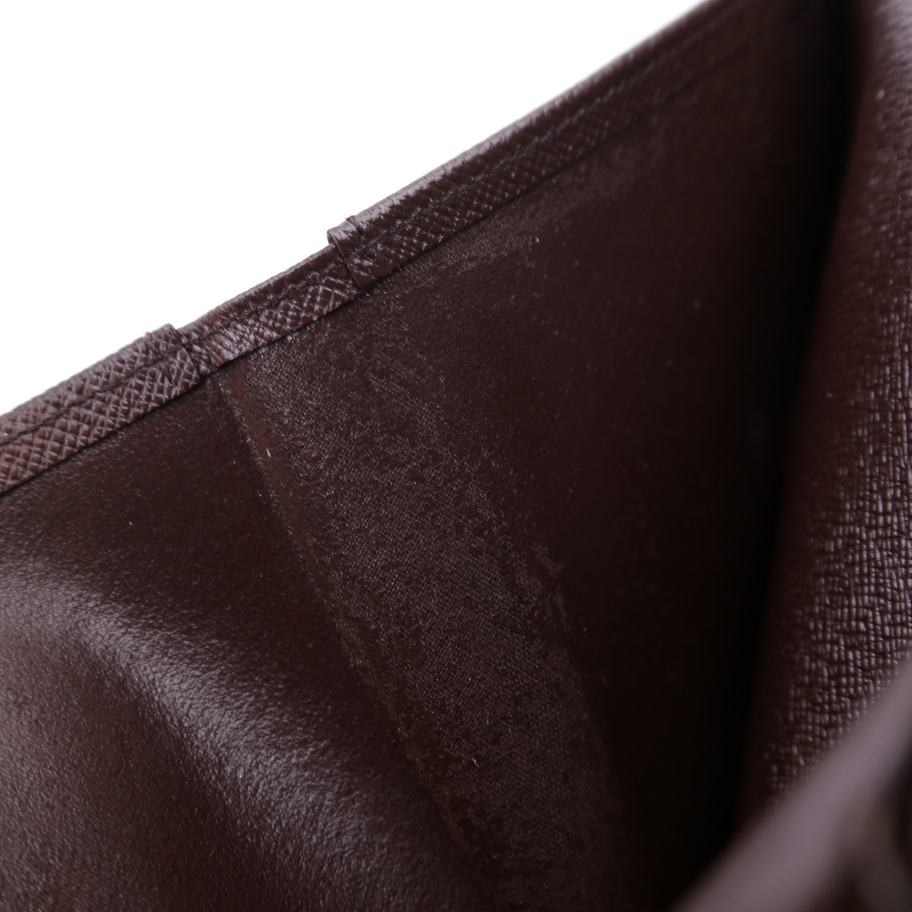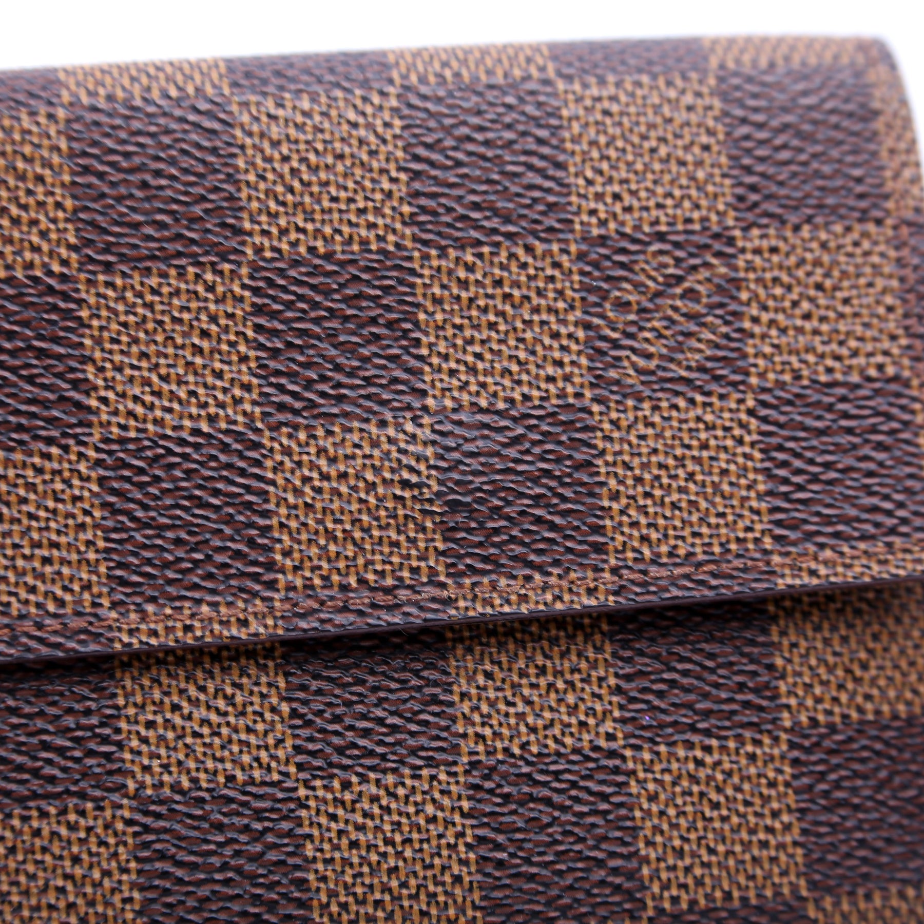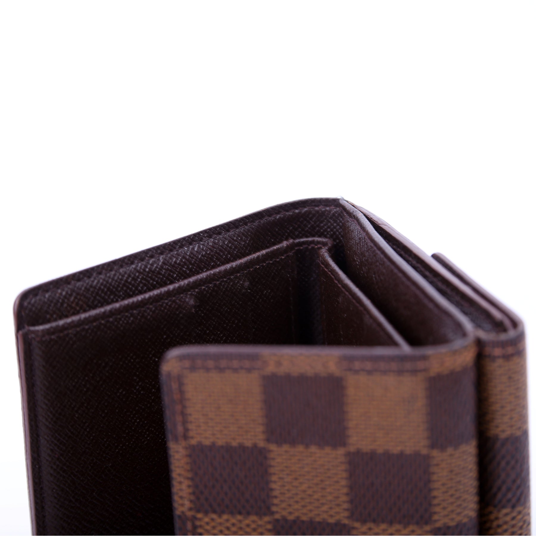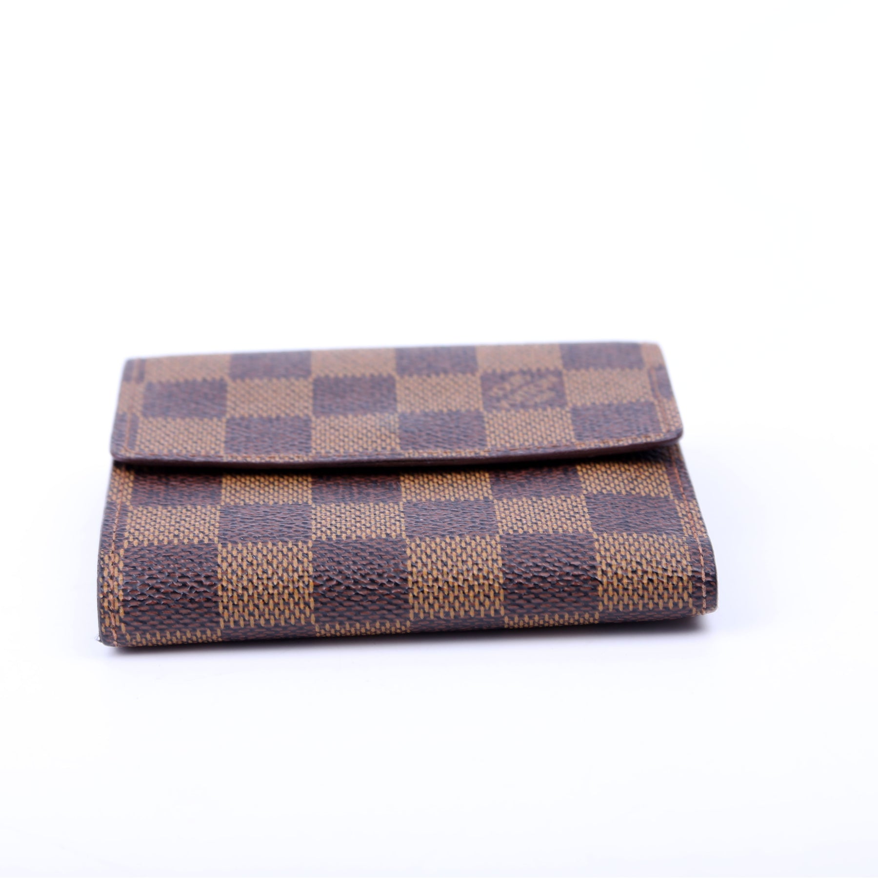 This pre-owned Louis Vuitton Elise Wallet is guaranteed 100% authentic. The exterior is in the classic Louis Vuitton Damier Ebene coated canvas.