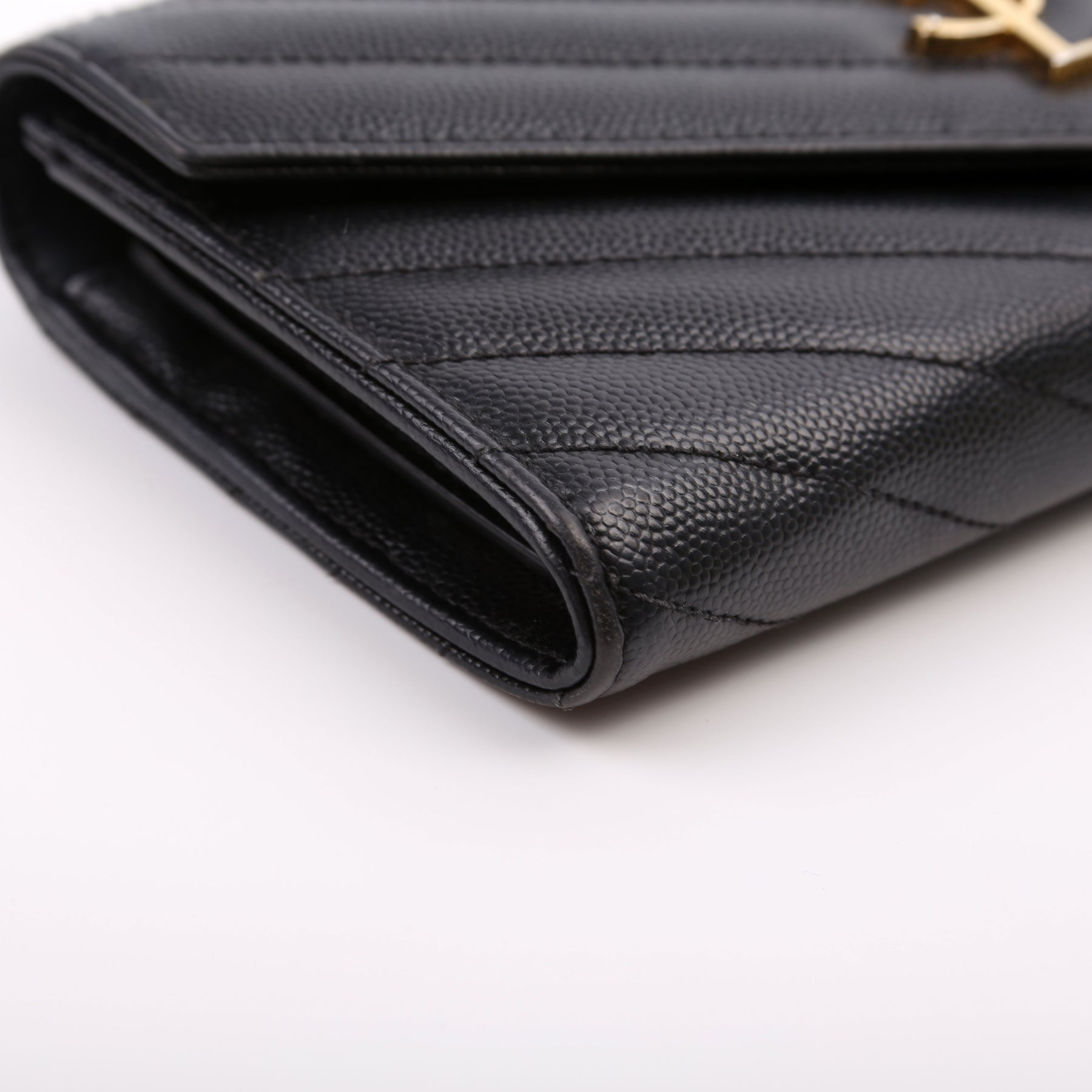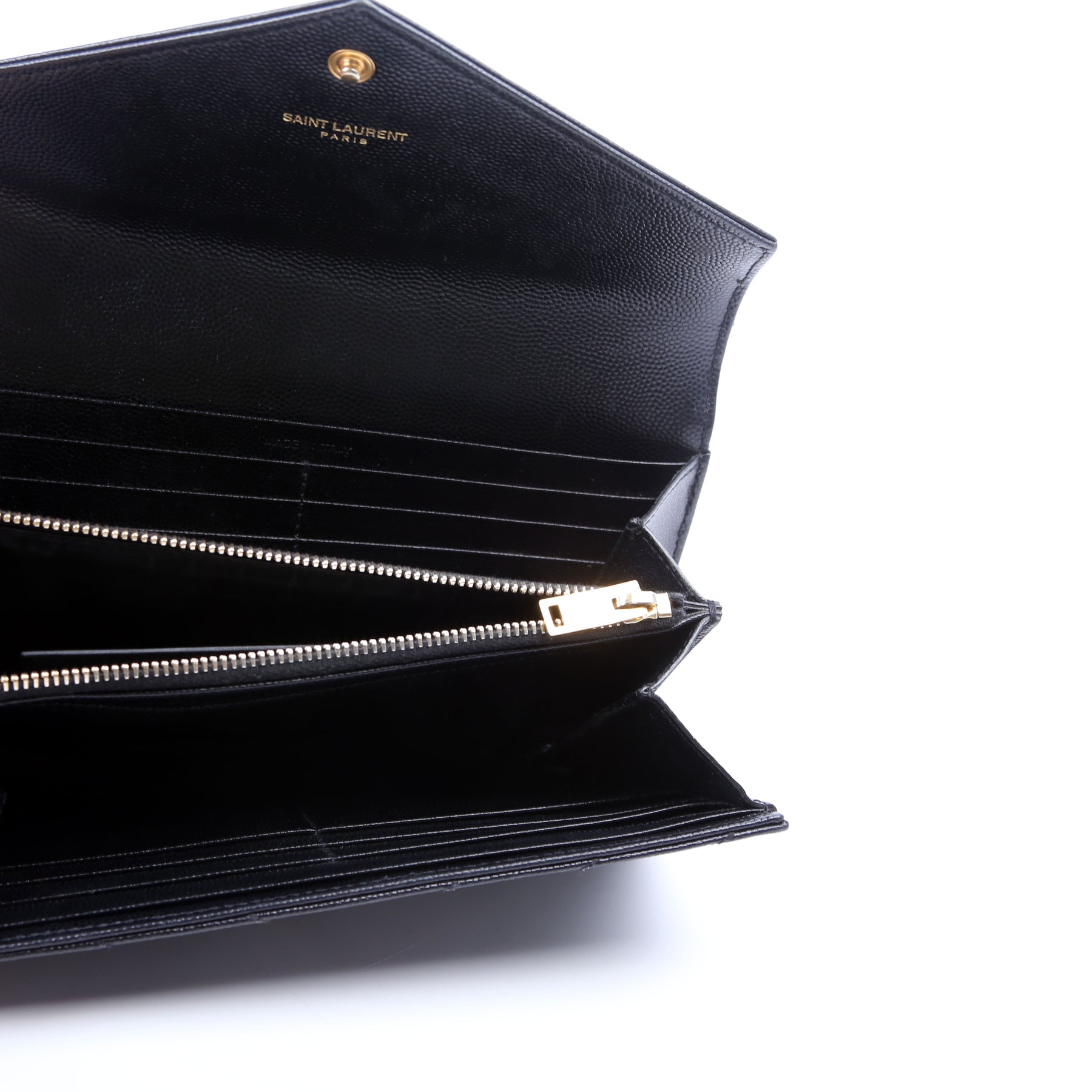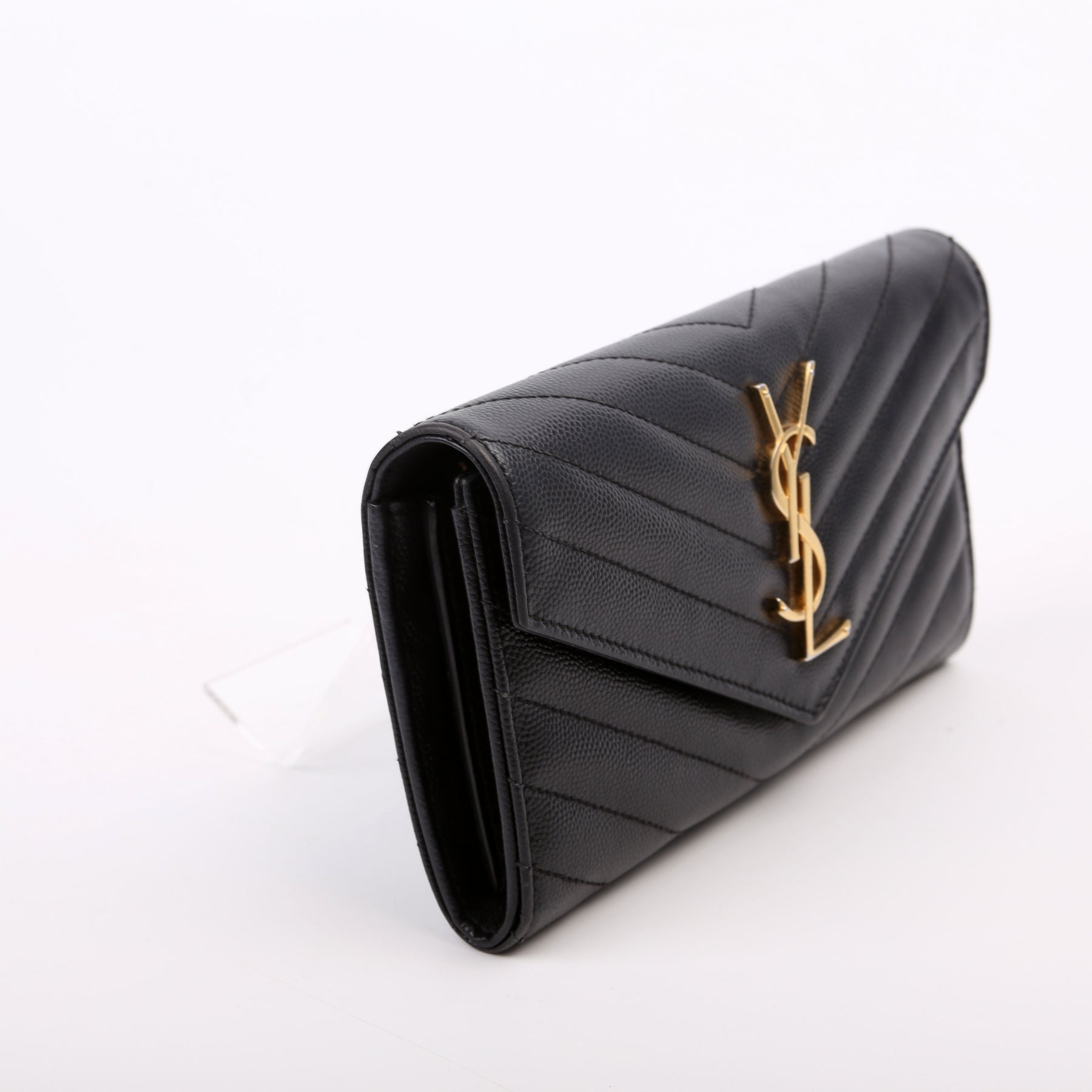 This pre-owned Saint Laurent Flap Wallet Large is guaranteed 100% authentic. The exterior is in the classic Saint Laurent Grain De Poudre leather.