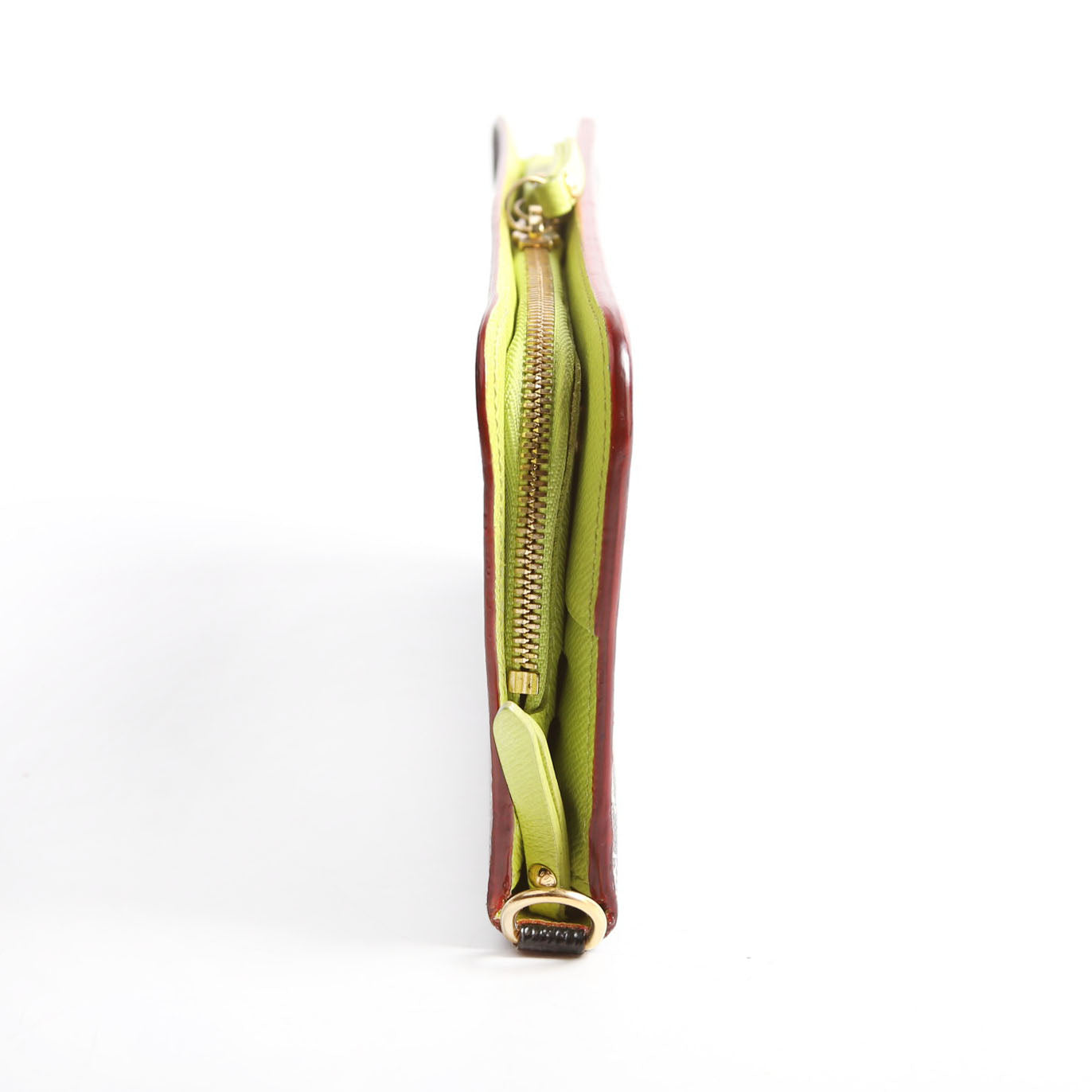 Interior: The interior is clean and free of rips or tears. The interior features twelve card slots, two zip closure coin pouches, two bill slots, and one open slot.