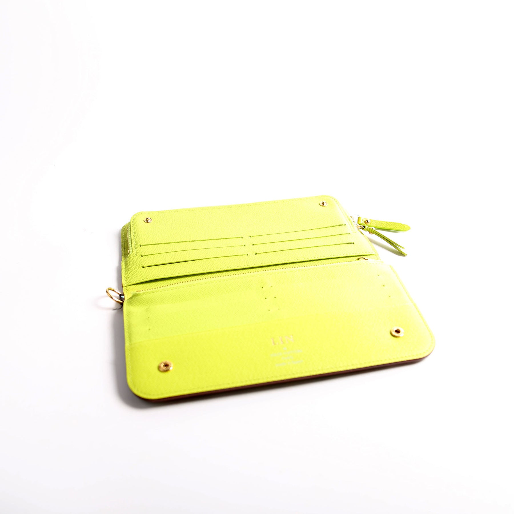 Interior: The interior features a "LIN" hot stamp but is clean and free of rips or tears. The interior features twelve card slots, two zip closure coin pouches, two bill slots, and one open slot.