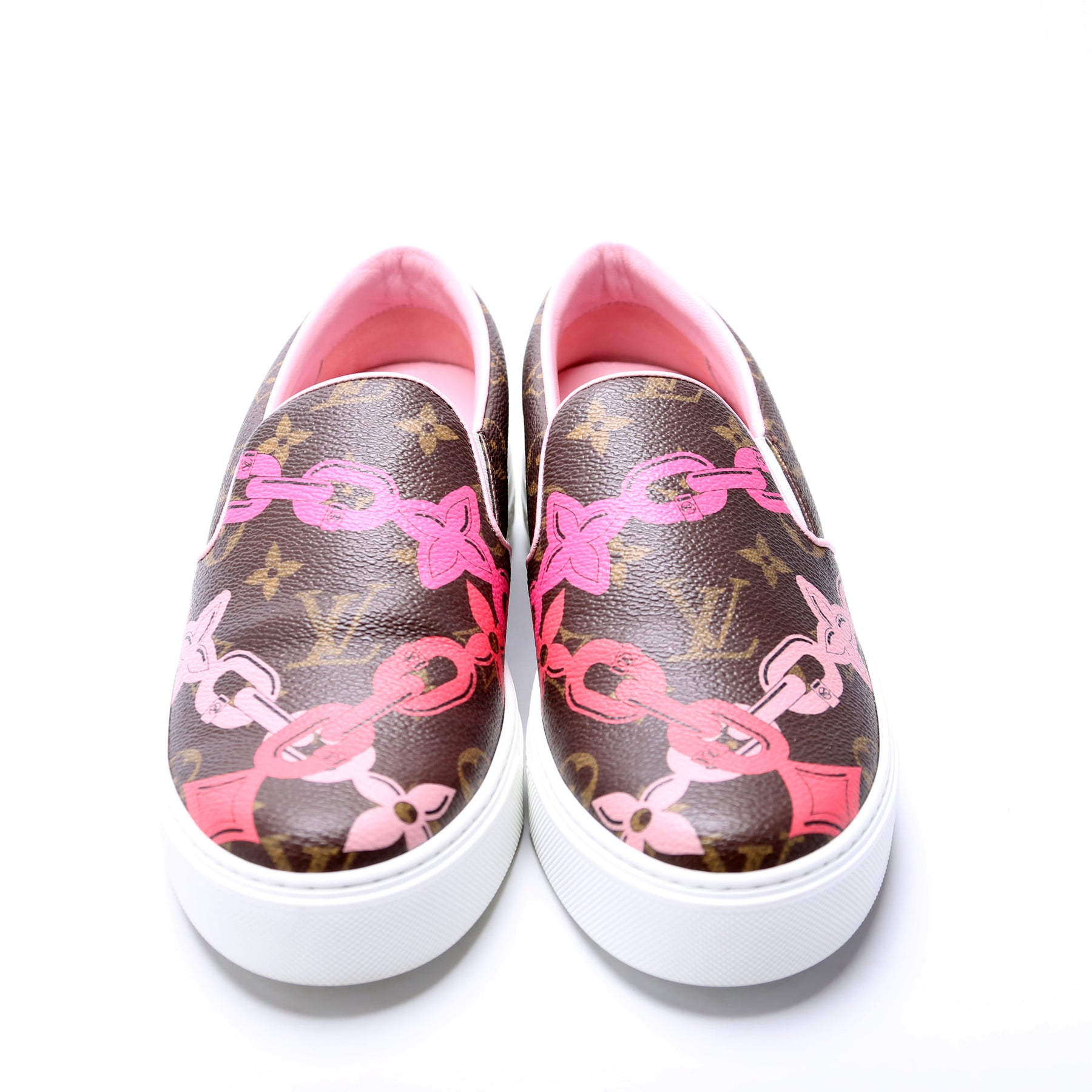 These pre-owned Louis Vuitton Monogram Chain Slip On Sneakers are guaranteed 100% authentic.