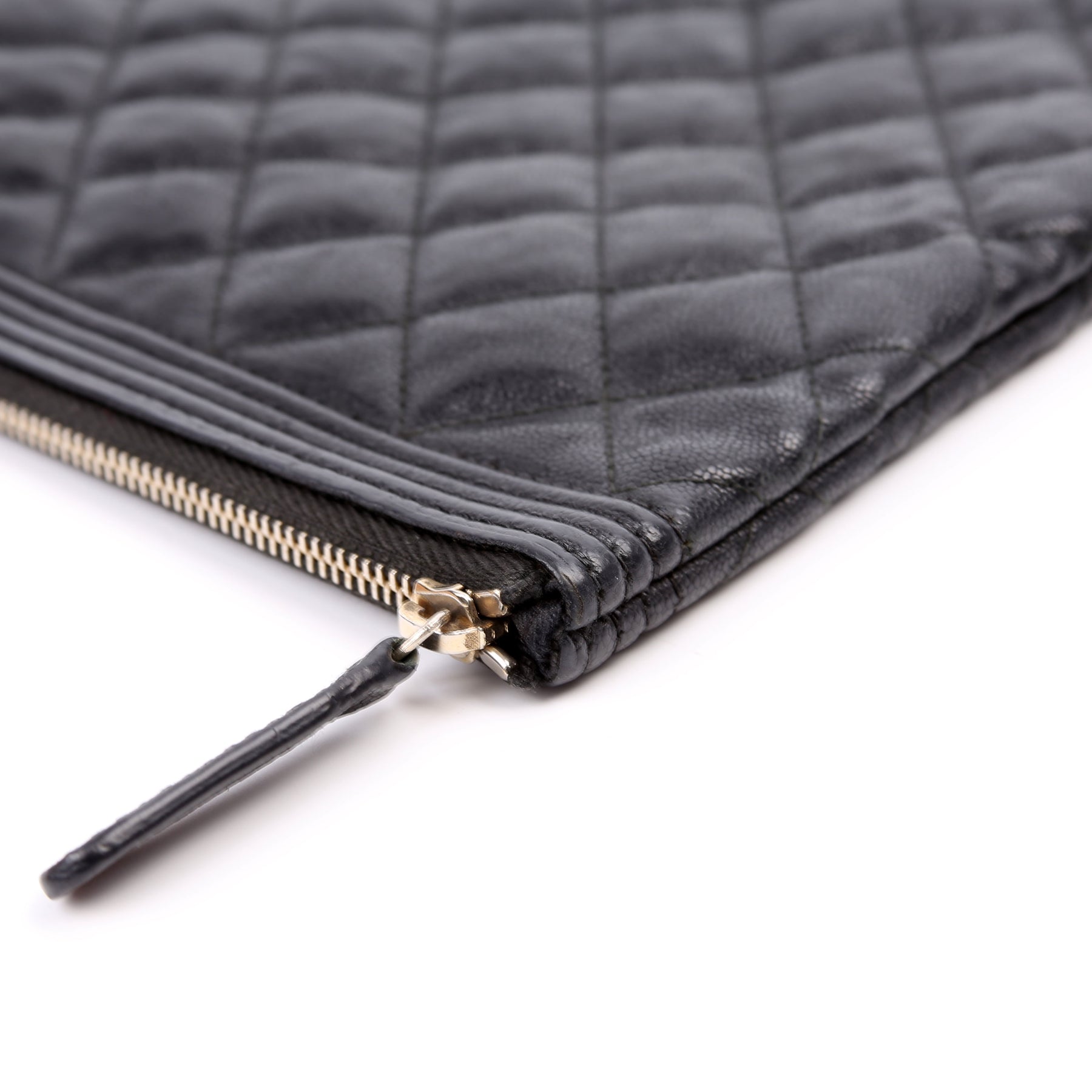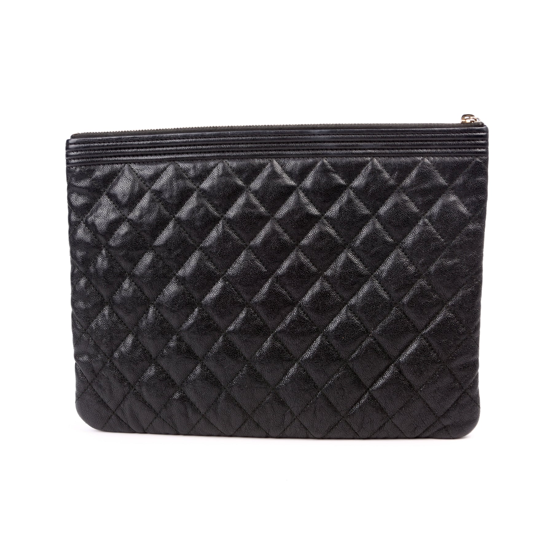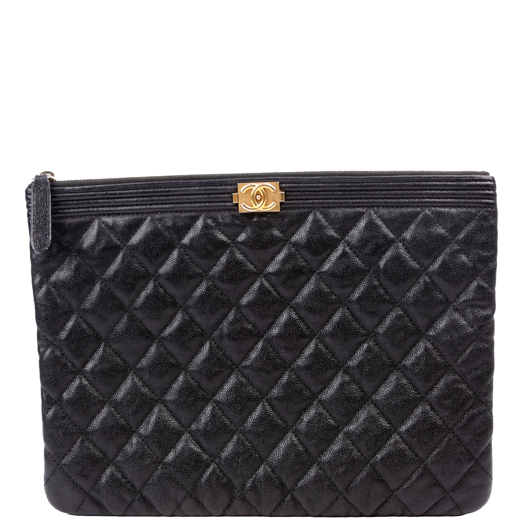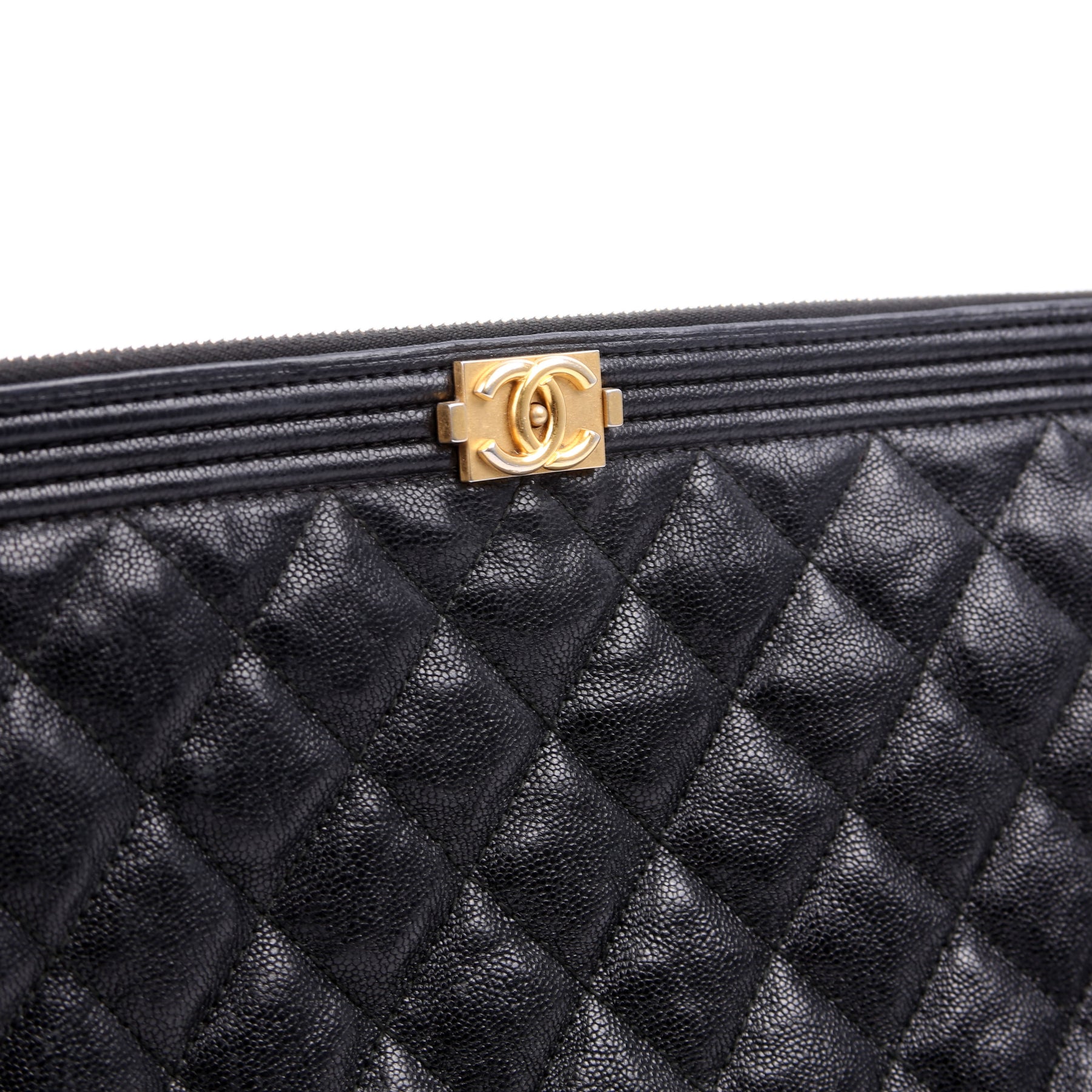 This pre-owned Chanel O Case Boy Medium is guaranteed 100% authentic. The exterior is in the classic Chanel Caviar leather.