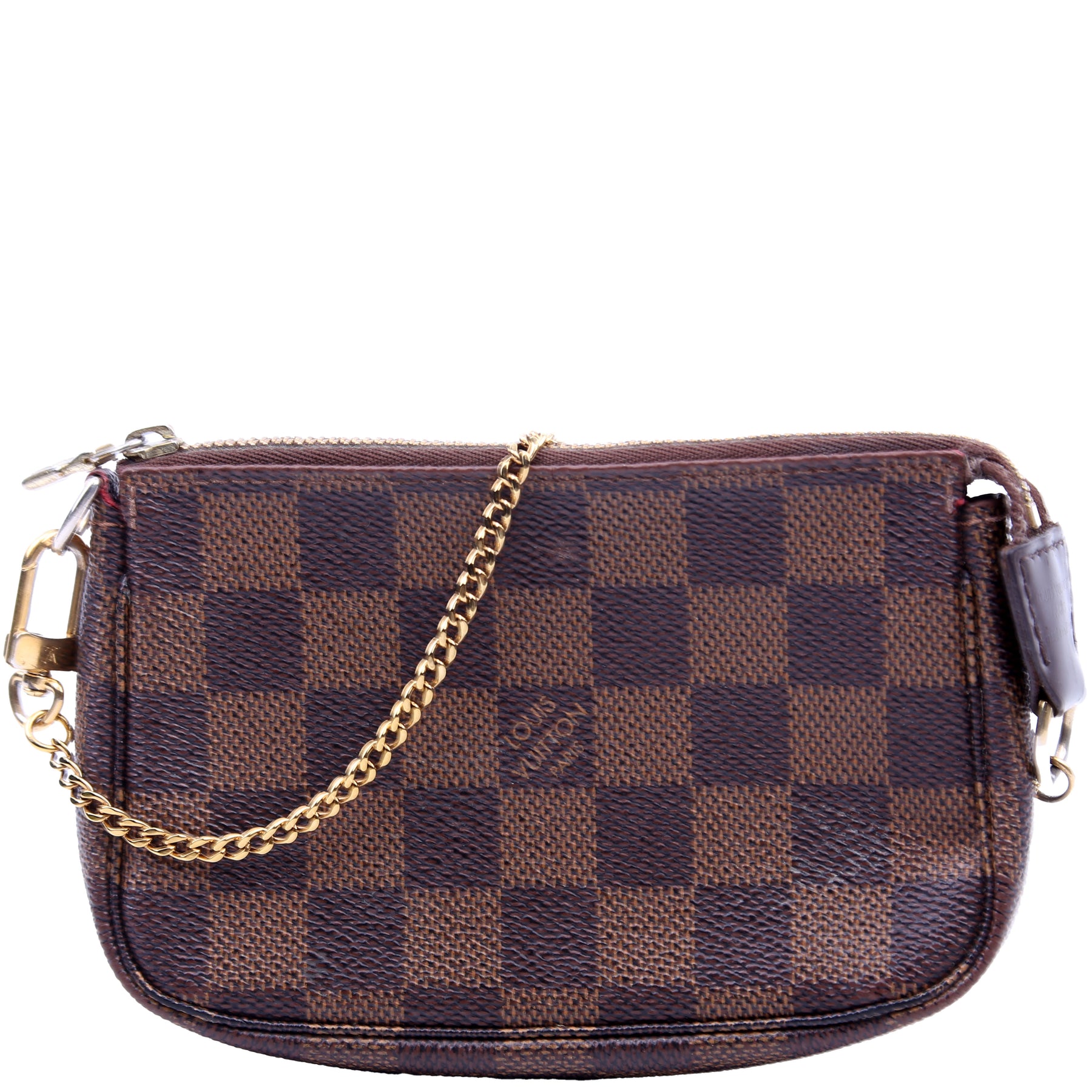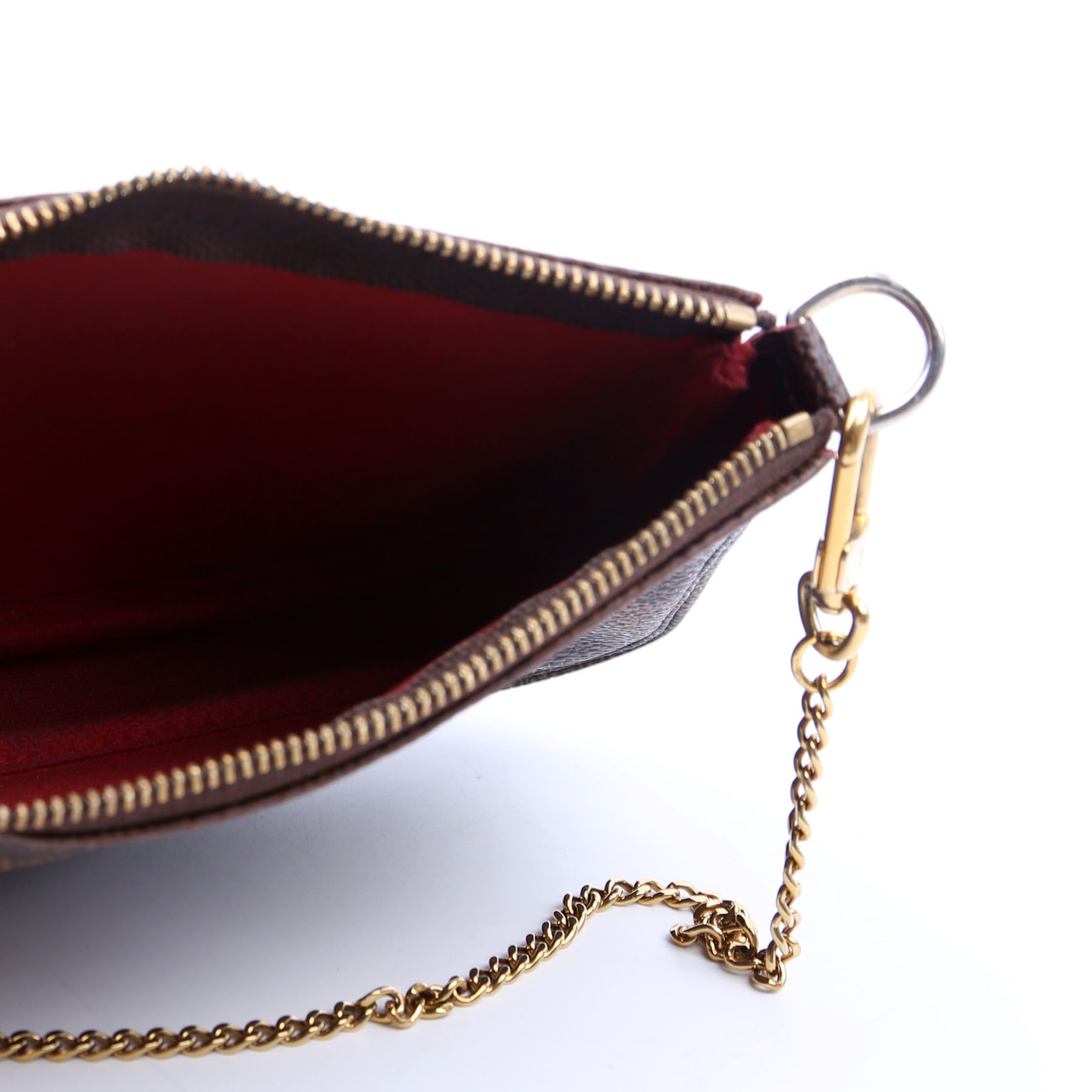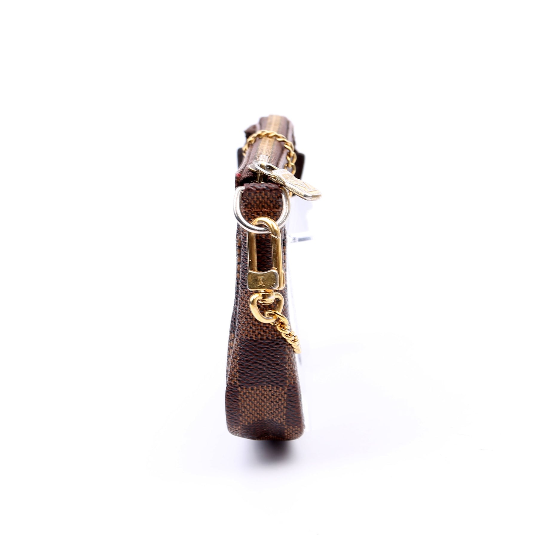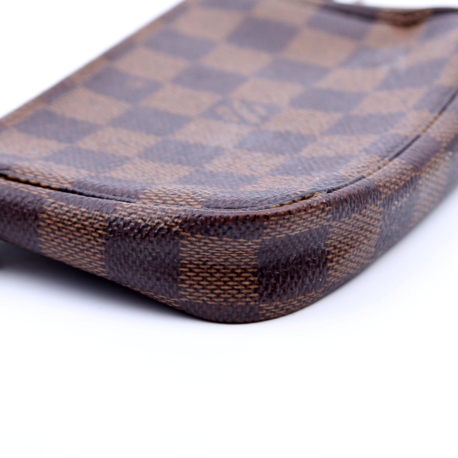 This pre-owned Louis Vuitton Pochette Accessories Mini is guaranteed 100% authentic. The exterior is in the classic Louis Vuitton Monogram coated canvas.
