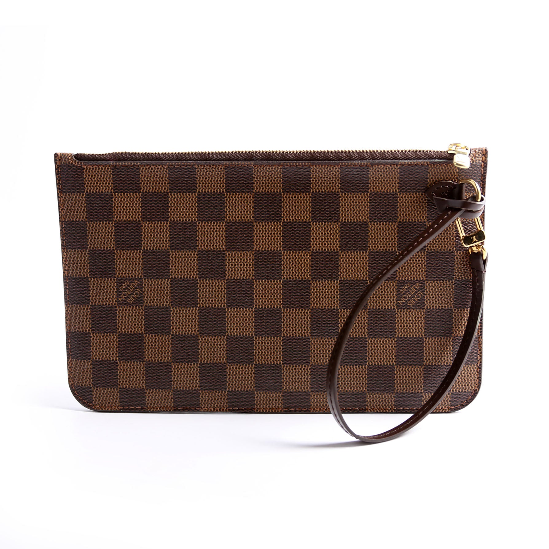 This pre-owned Louis Vuitton Pochette Damier Ebene Neverfull is guaranteed 100% authentic.