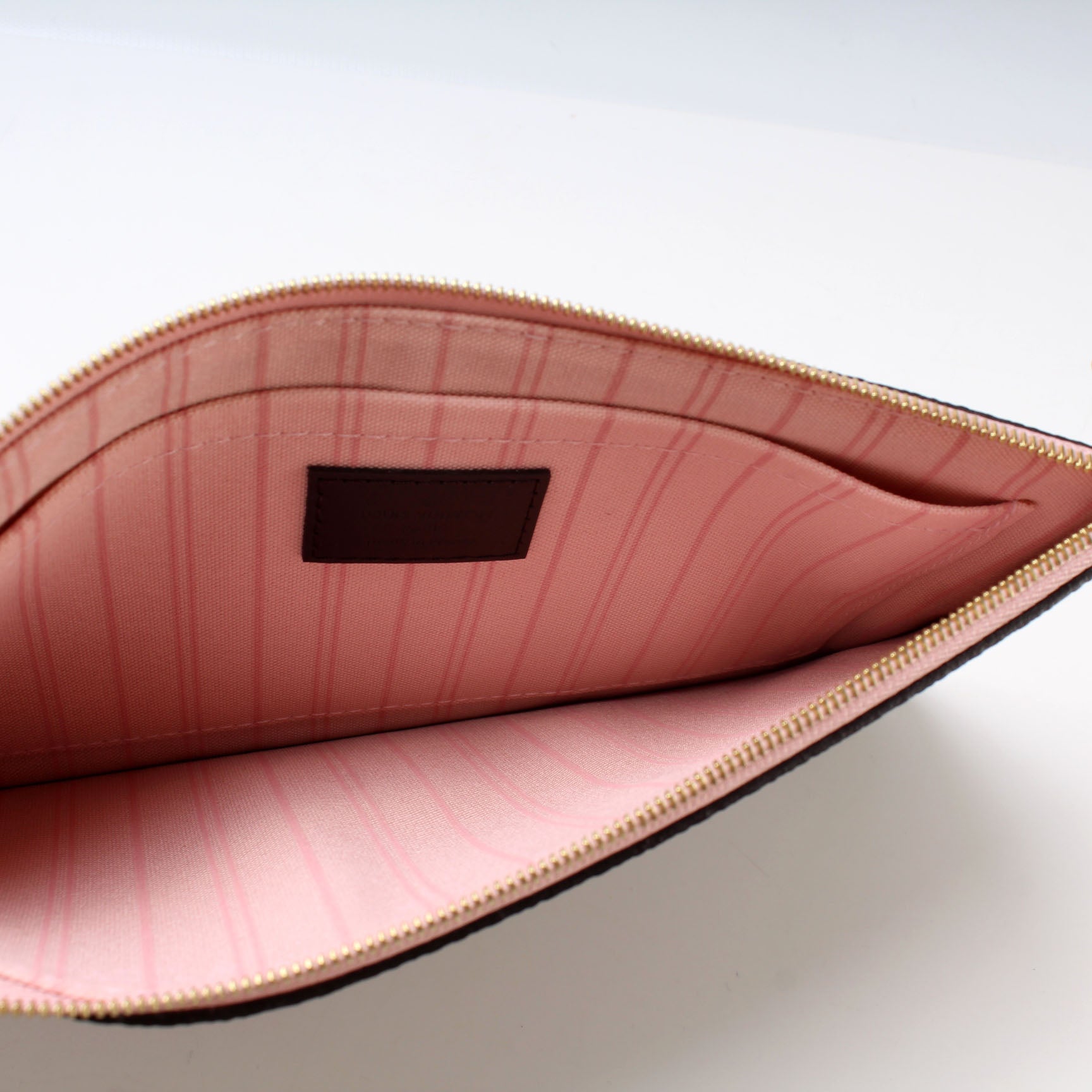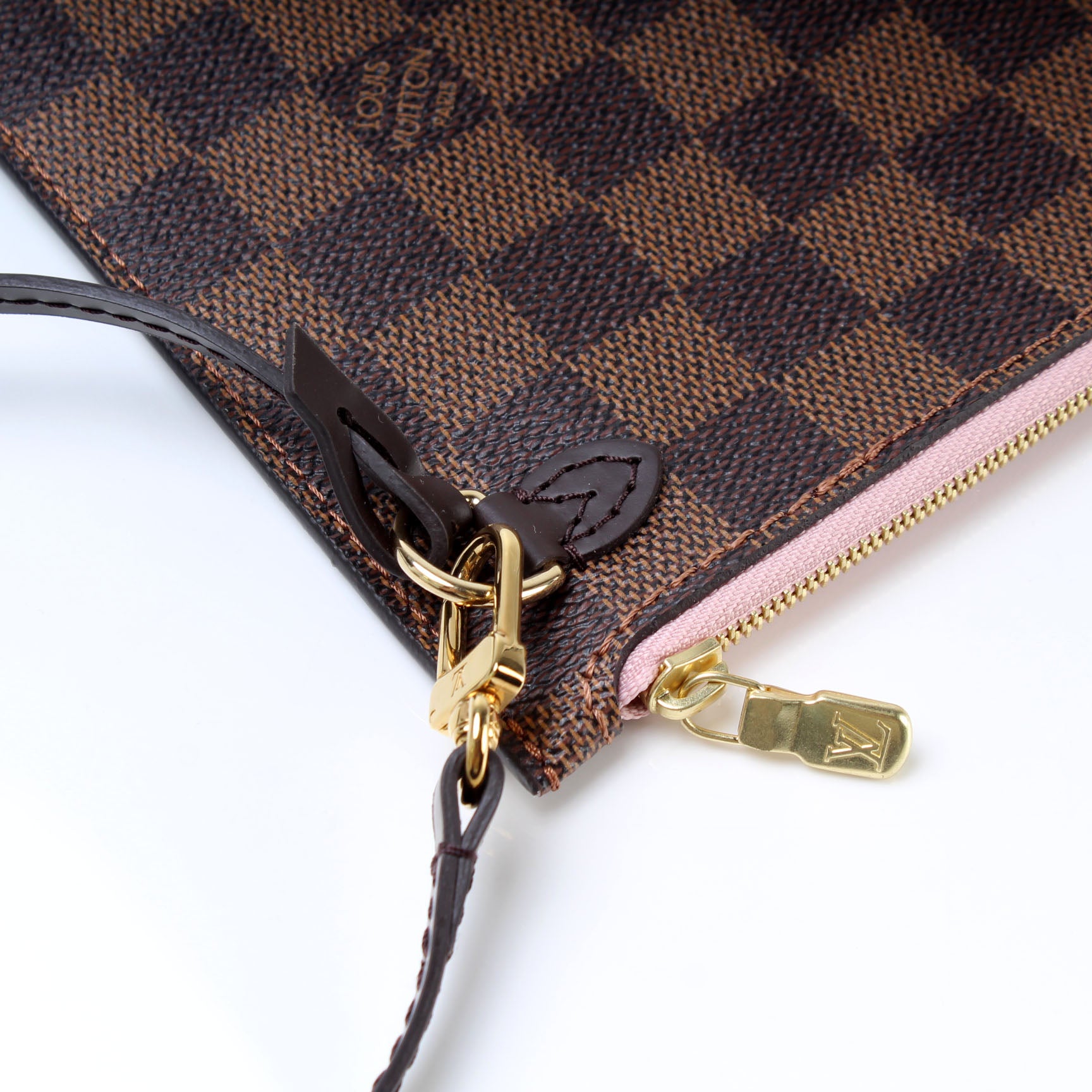 This pre-owned Louis Vuitton Pochette Only Neverfull is guaranteed 100% authentic. The exterior is in the classic Louis Vuitton Damier Ebene coated canvas.