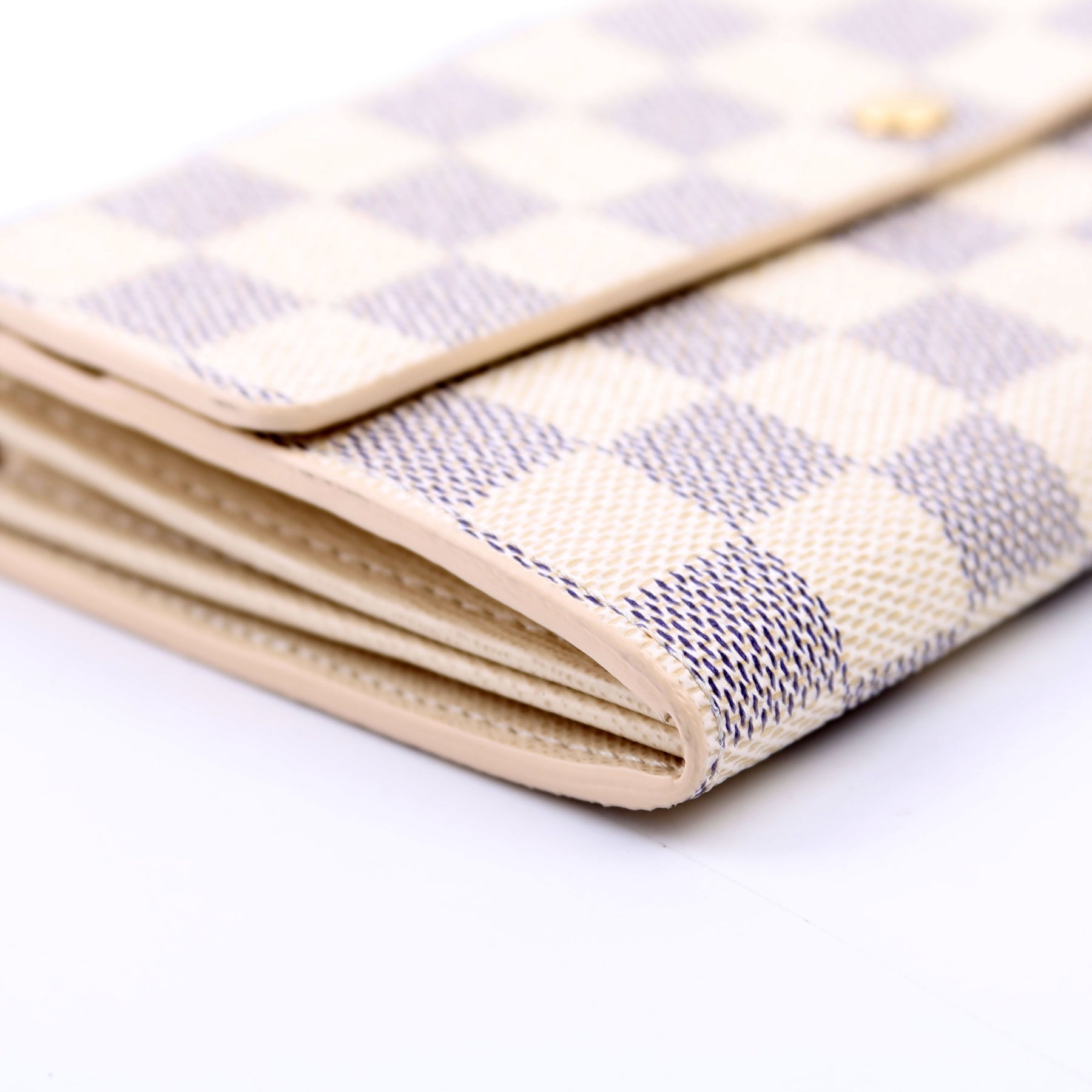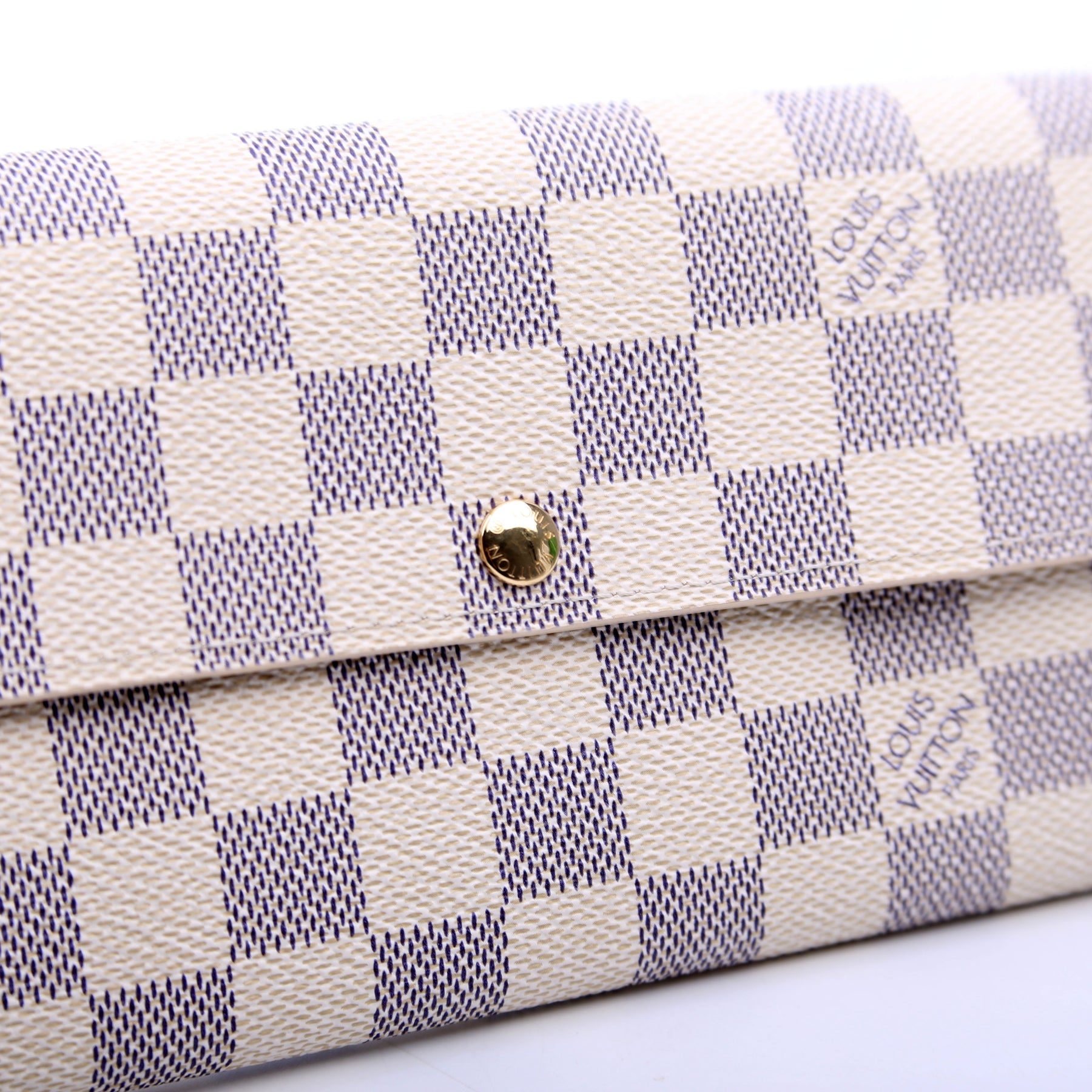This pre-owned Louis Vuitton Sarah Wallet is guaranteed 100% authentic. The exterior is in the classic Louis Vuitton Damier Azur coated canvas.