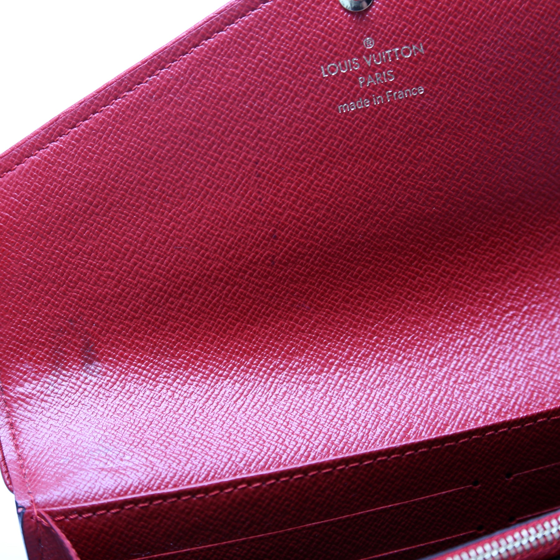 This pre-owned Louis Vuitton Sarah Wallet Retiro is guaranteed 100% authentic. The exterior is in the classic Louis Vuitton Monogram coated canvas.