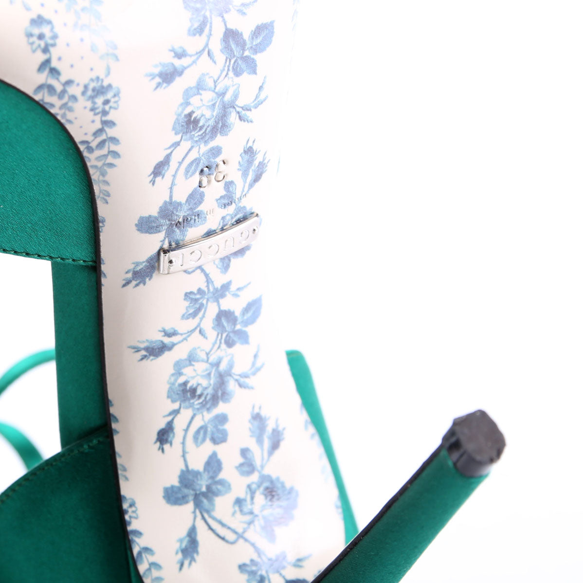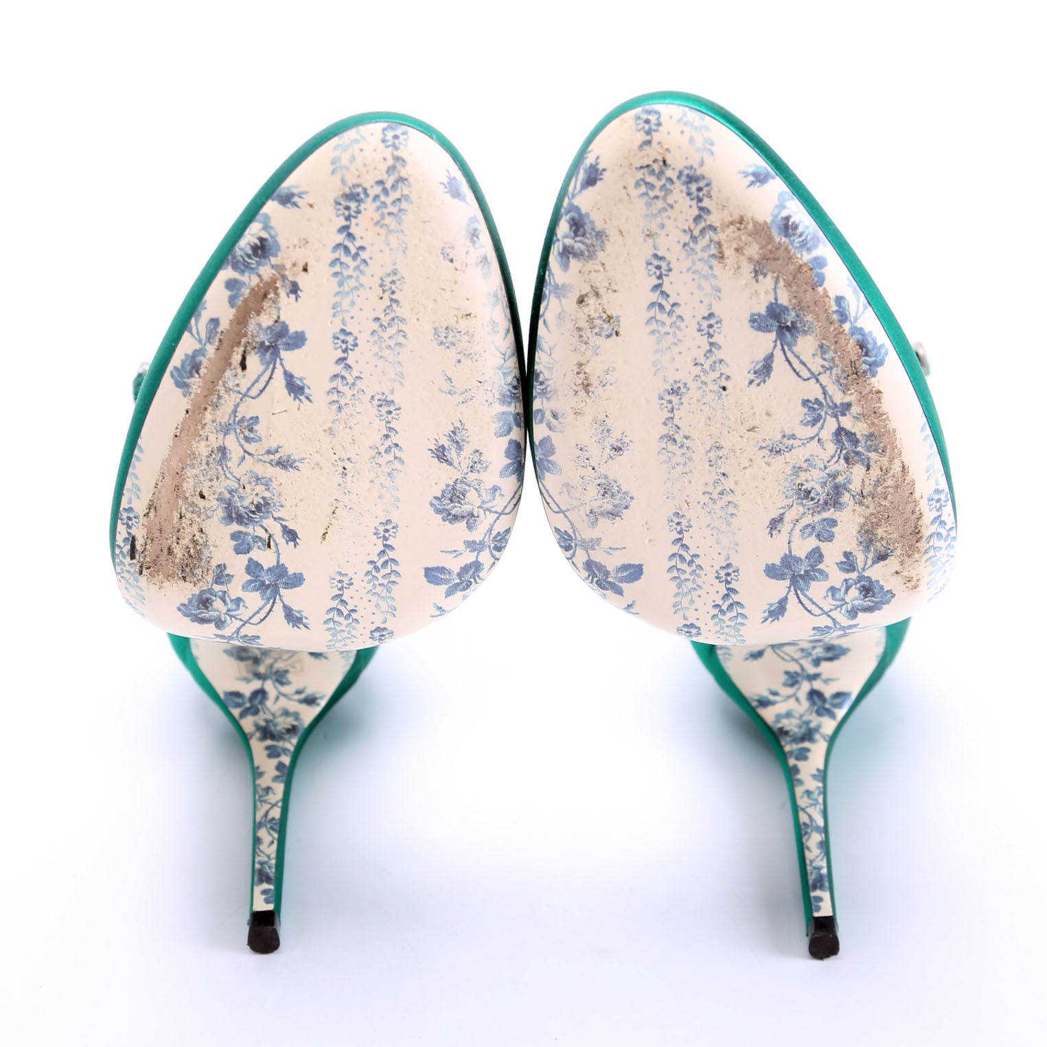 These pre-owned Gucci Satin Daisy Ankle Strap 105 Pumps are guaranteed 100% authentic.