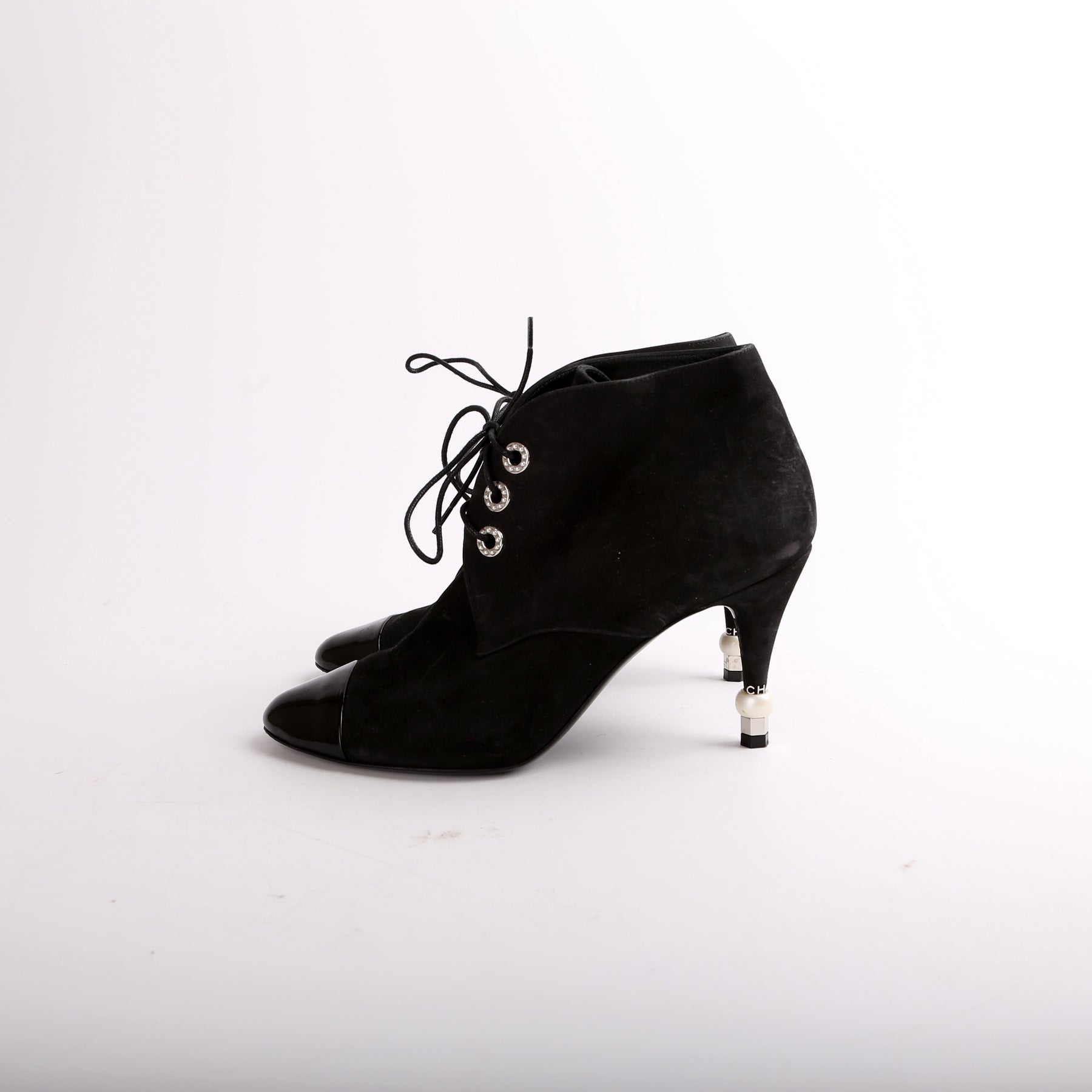 These pre-owned Chanel Suede Pearl Lace-Up Booties are guaranteed 100% authentic.