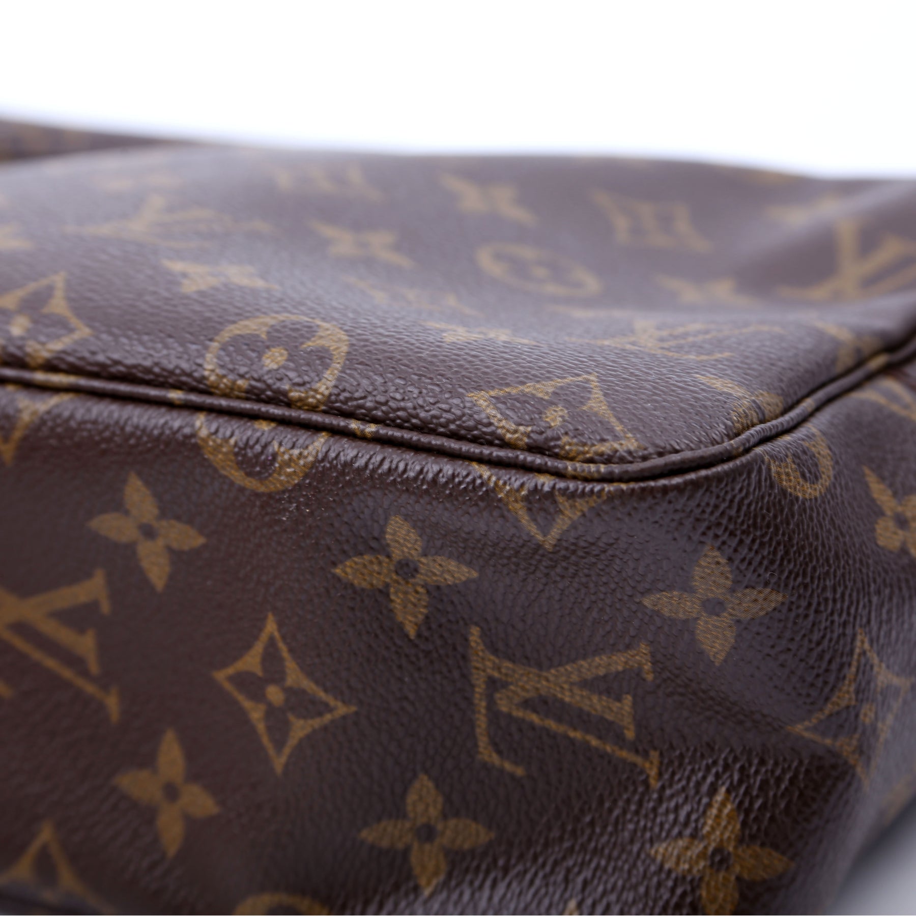 Exterior: The exterior Monogram coated canvas is free of any rips or cracks, there is light discoloration throughout. The corners and edges show light rubbing.