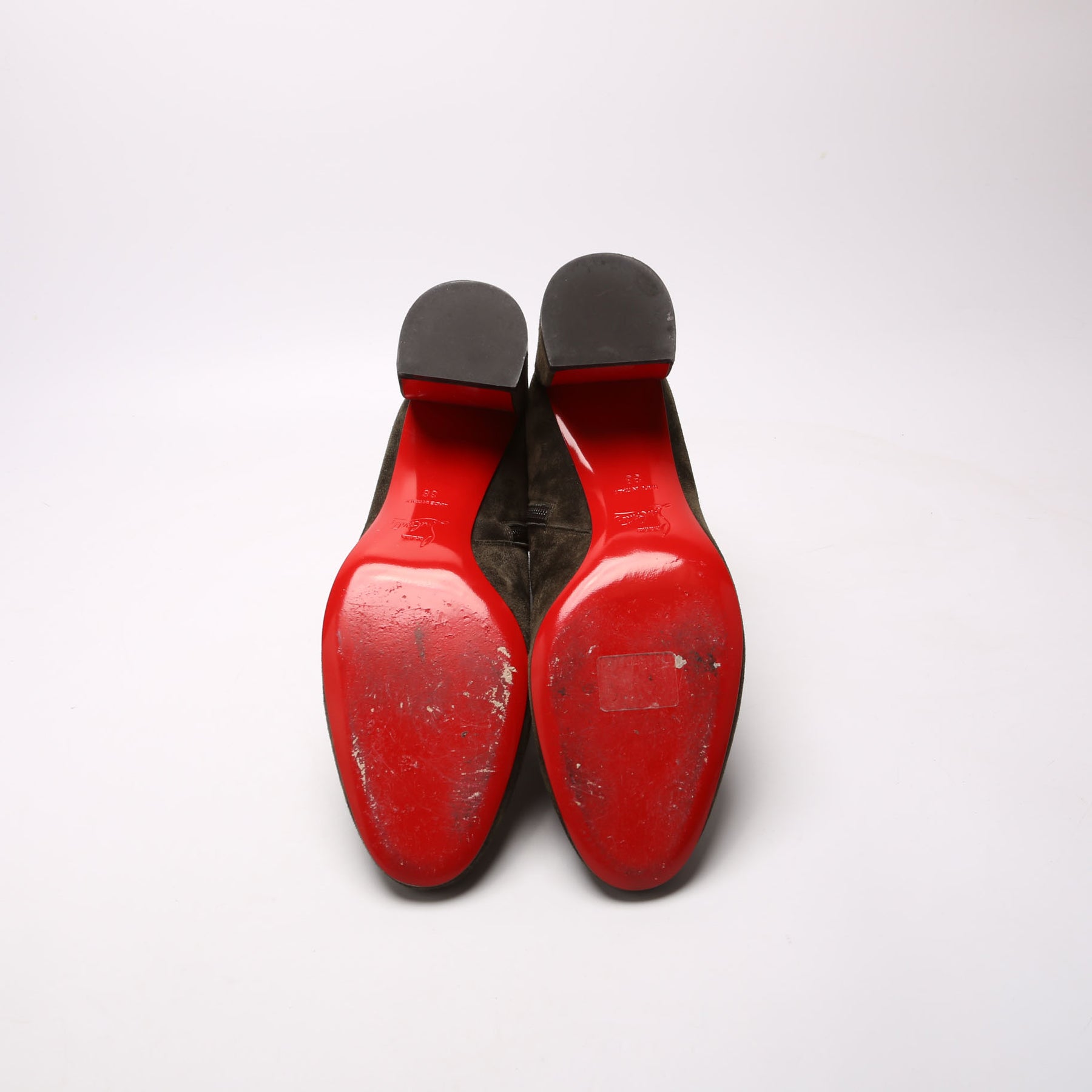 These pre-owned Christian Louboutin Turela 55MM Suede Ankle Boots are guaranteed 100% authentic.
