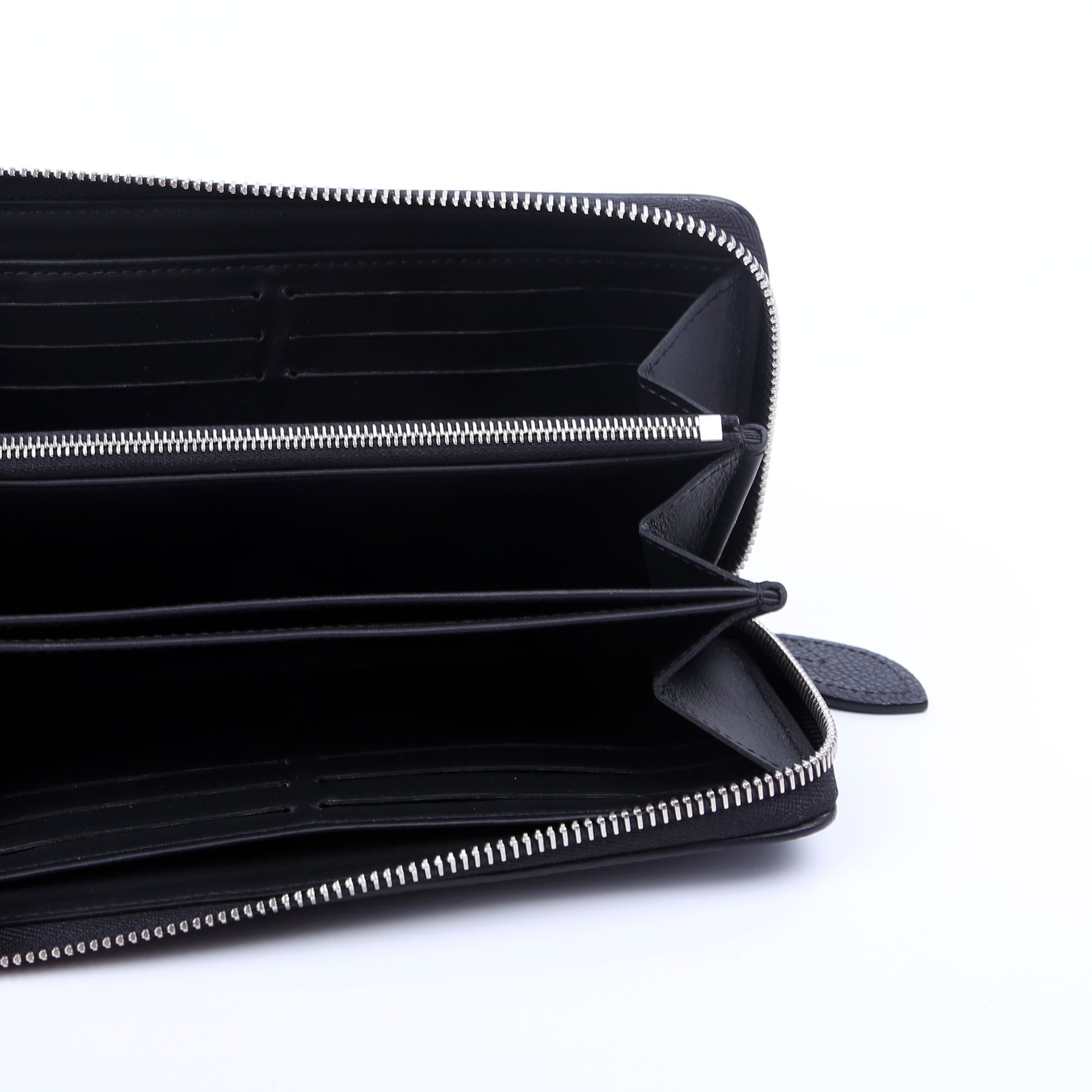 Interior: The interior is clean and free of rips or tears. The interior features one zip closure coin pouch, six bill slots, and twelve card slots.