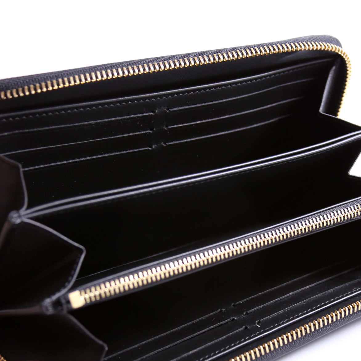 Interior: The interior is clean and free of rips or tears. The interior features one zip closure coin pouch, three bill slots, and twelve card slots.