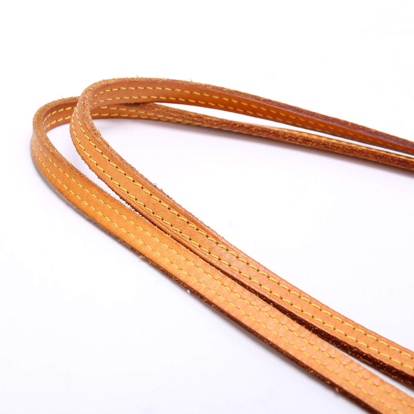 Handles: The leather handles show discoloration and wear. The piping shows wear.