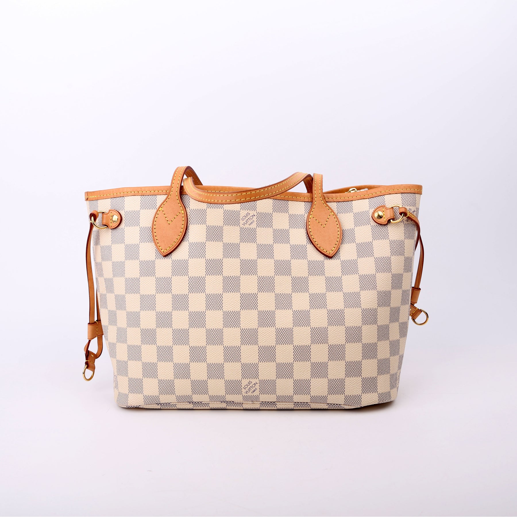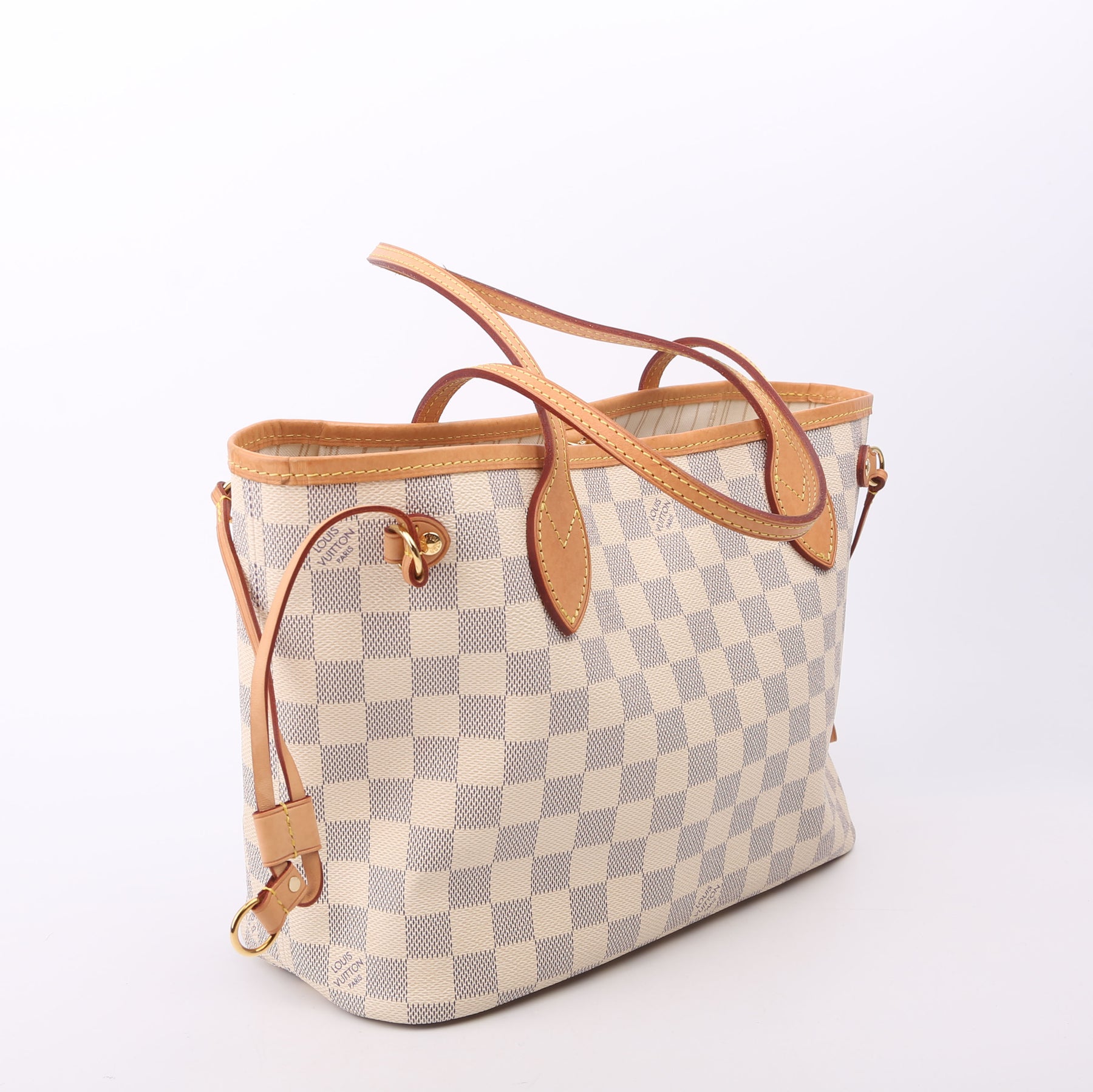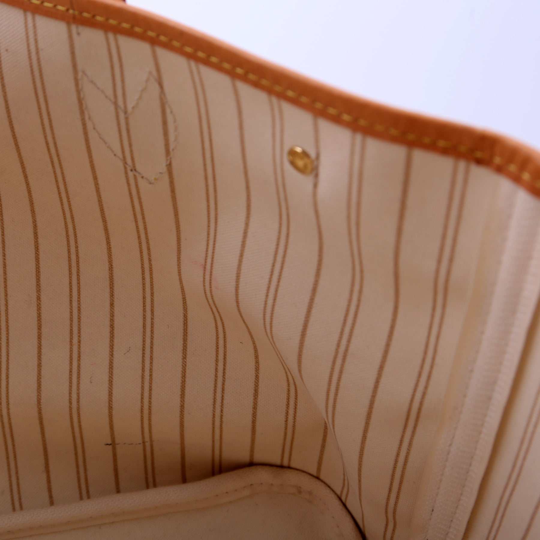 This pre-owned Louis Vuitton Neverfull With Wallet PM is guaranteed 100% authentic. The exterior is in the classic Louis Vuitton Damier Ebene coated canvas.