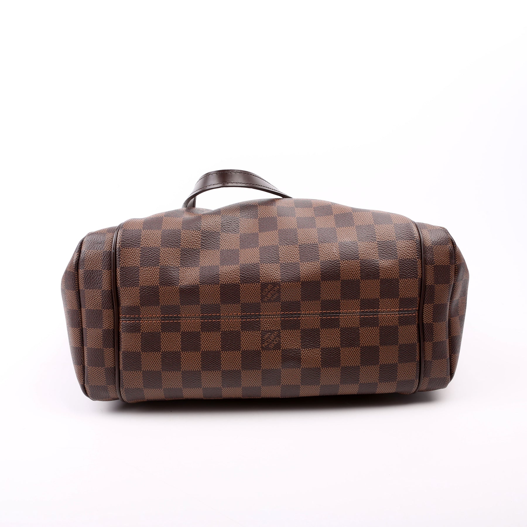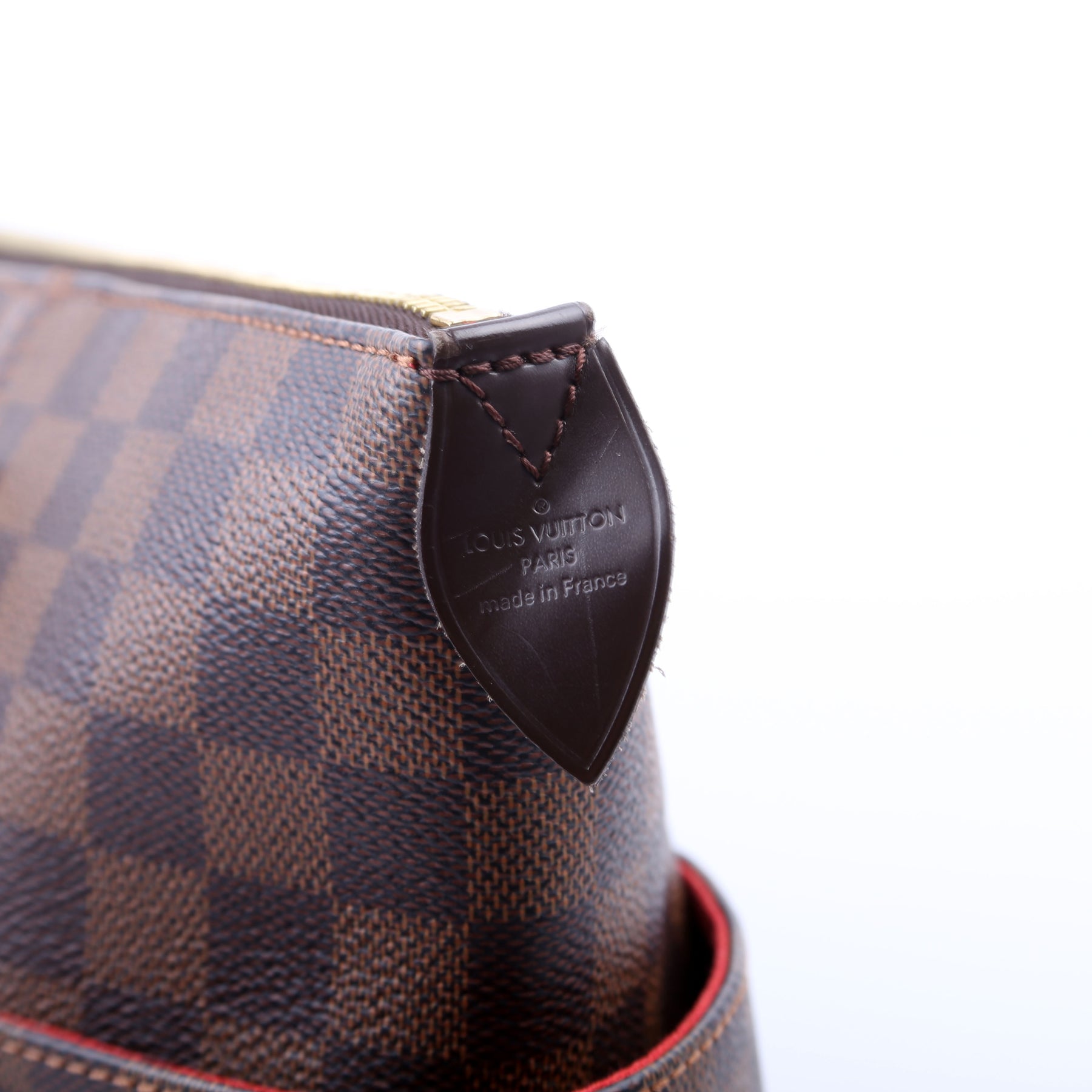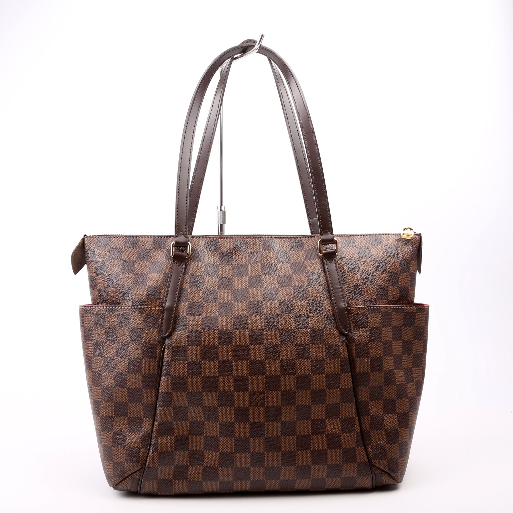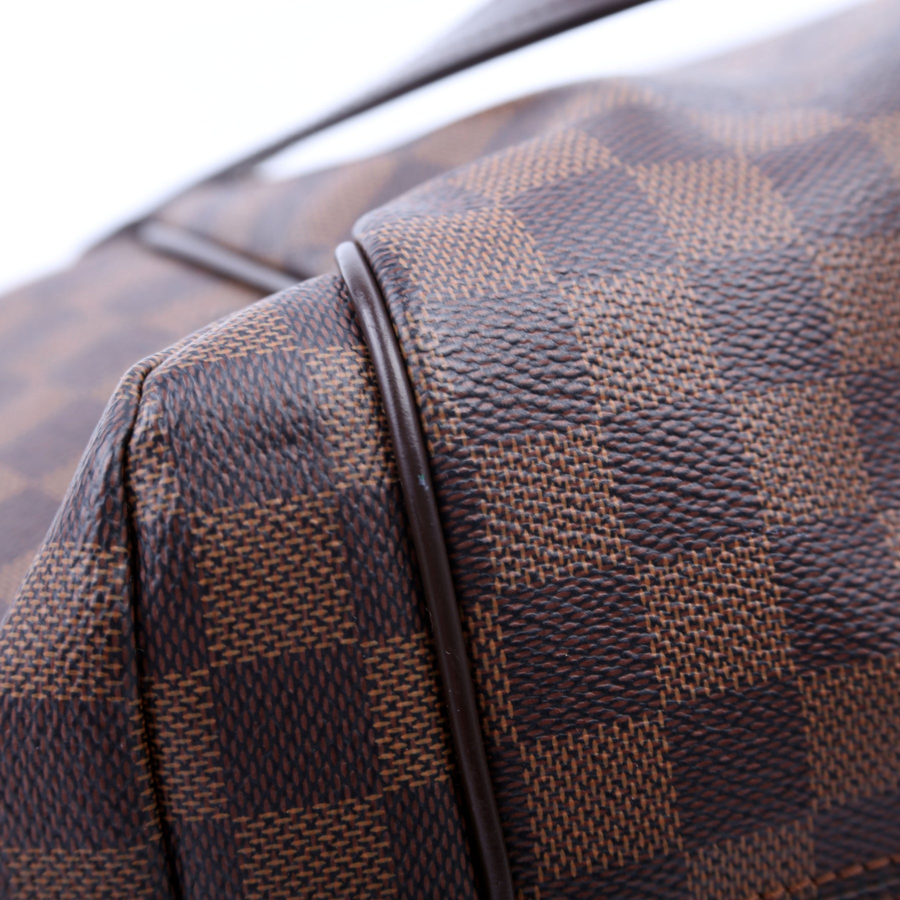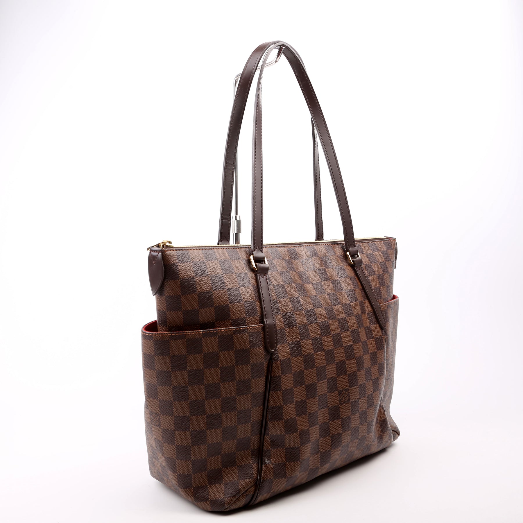 This pre-owned Louis Vuitton Totally MM is guaranteed 100% authentic. The exterior is in the classic Damier Ebene coated canvas.