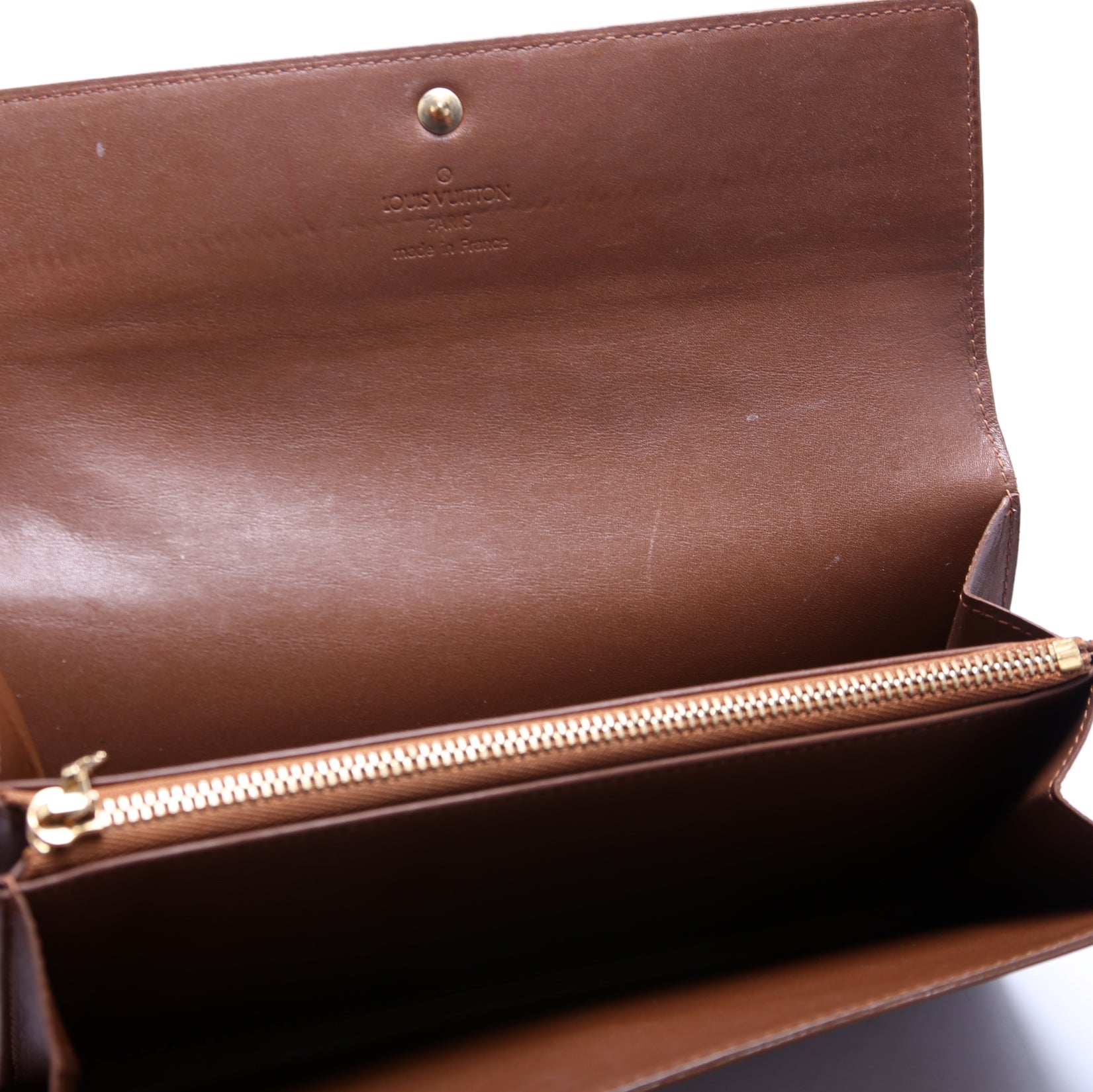 This pre-owned Louis Vuitton Sarah Wallet is guaranteed 100% authentic. The exterior is in the classic Louis Vuitton Vernis leather.