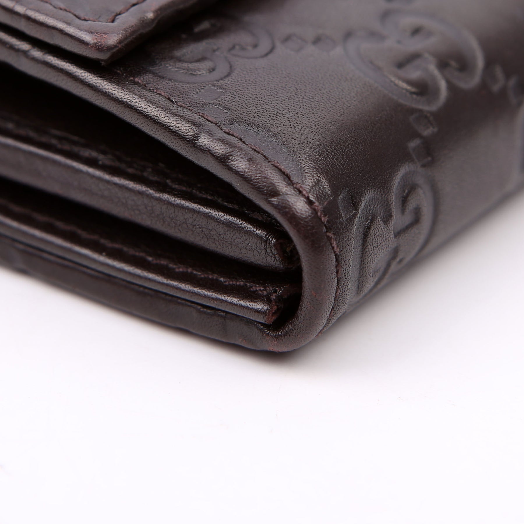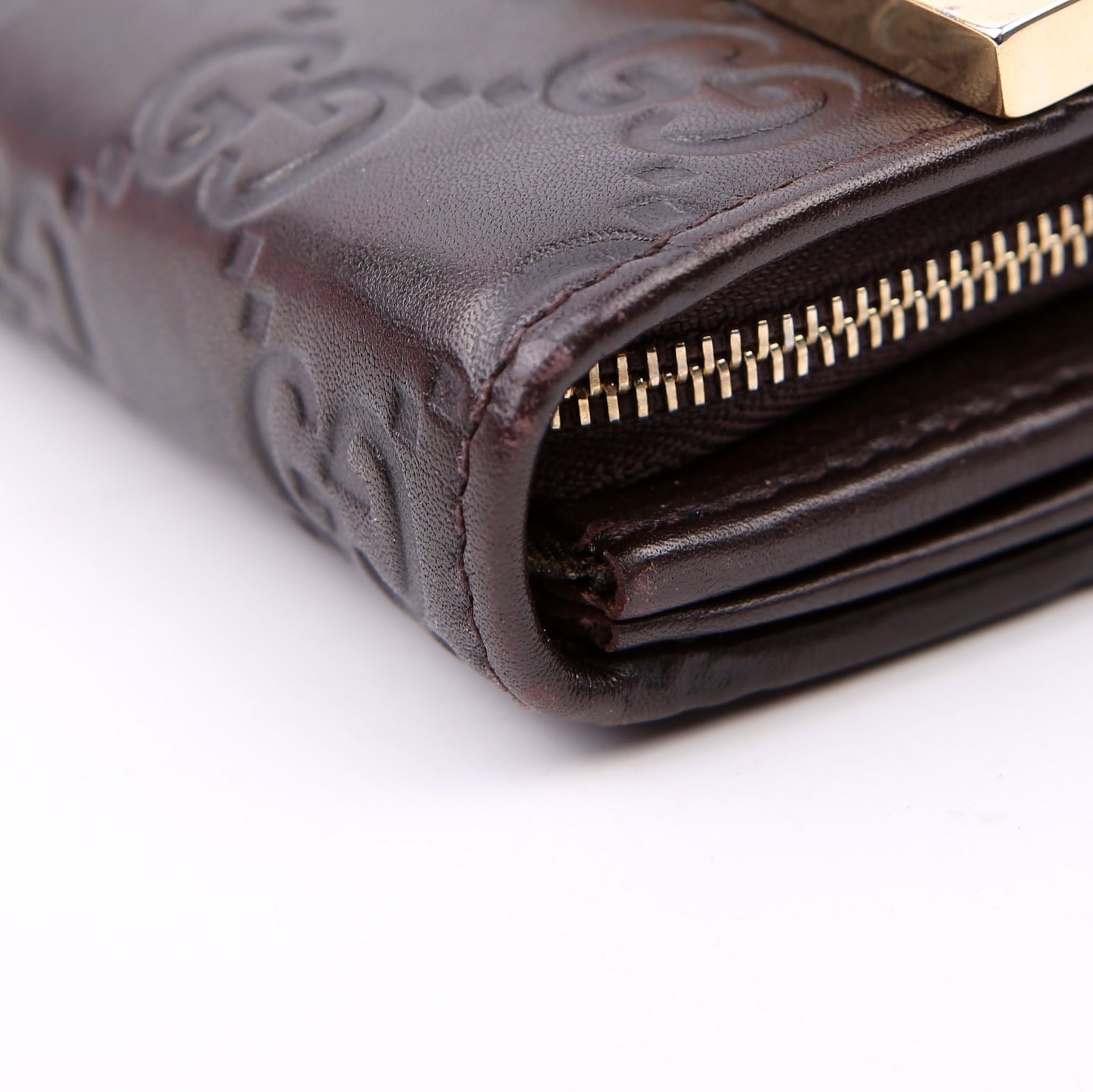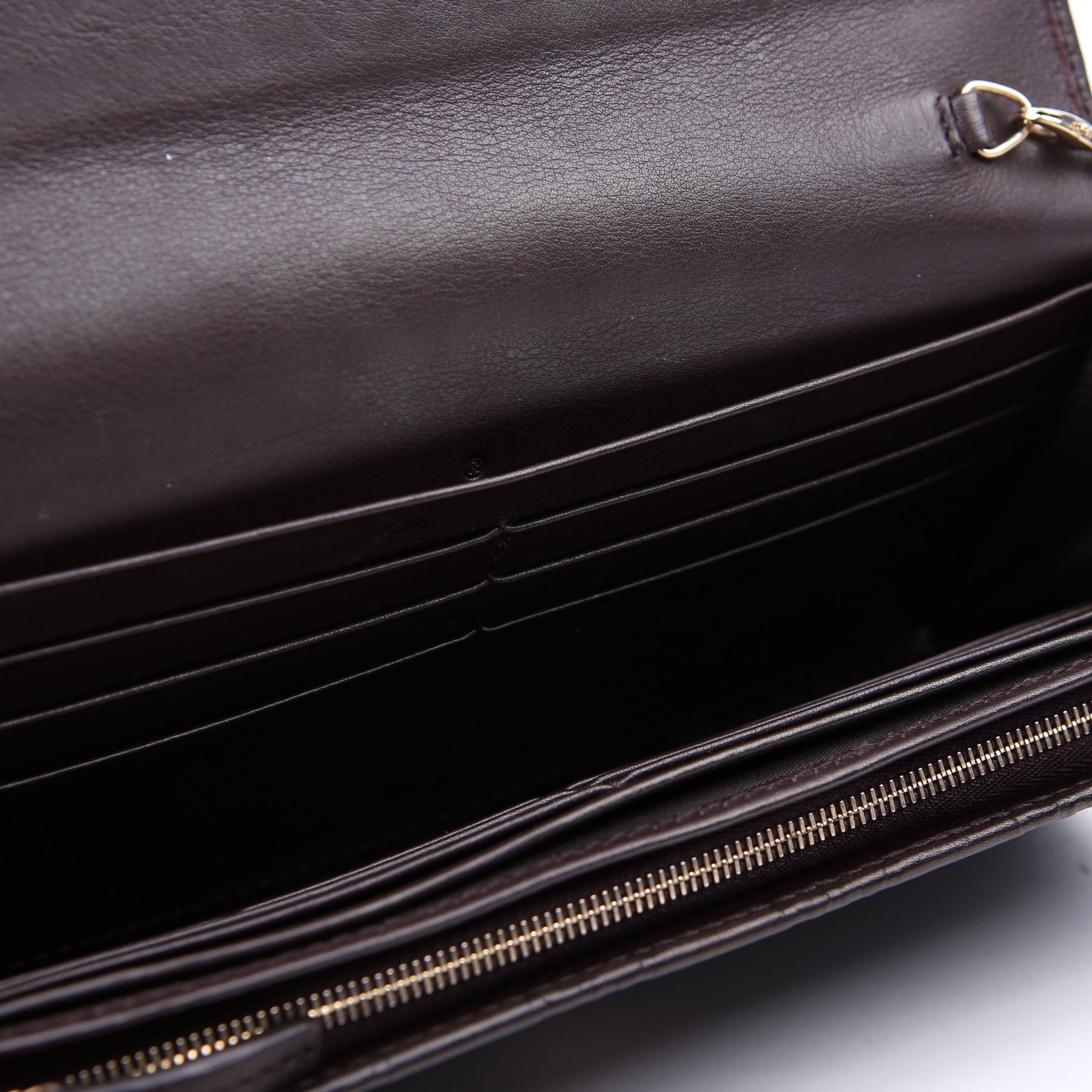Interior: The interior has minor scratches throughout, and features five bill slots, one zip closure pouch, and twelve card slots.