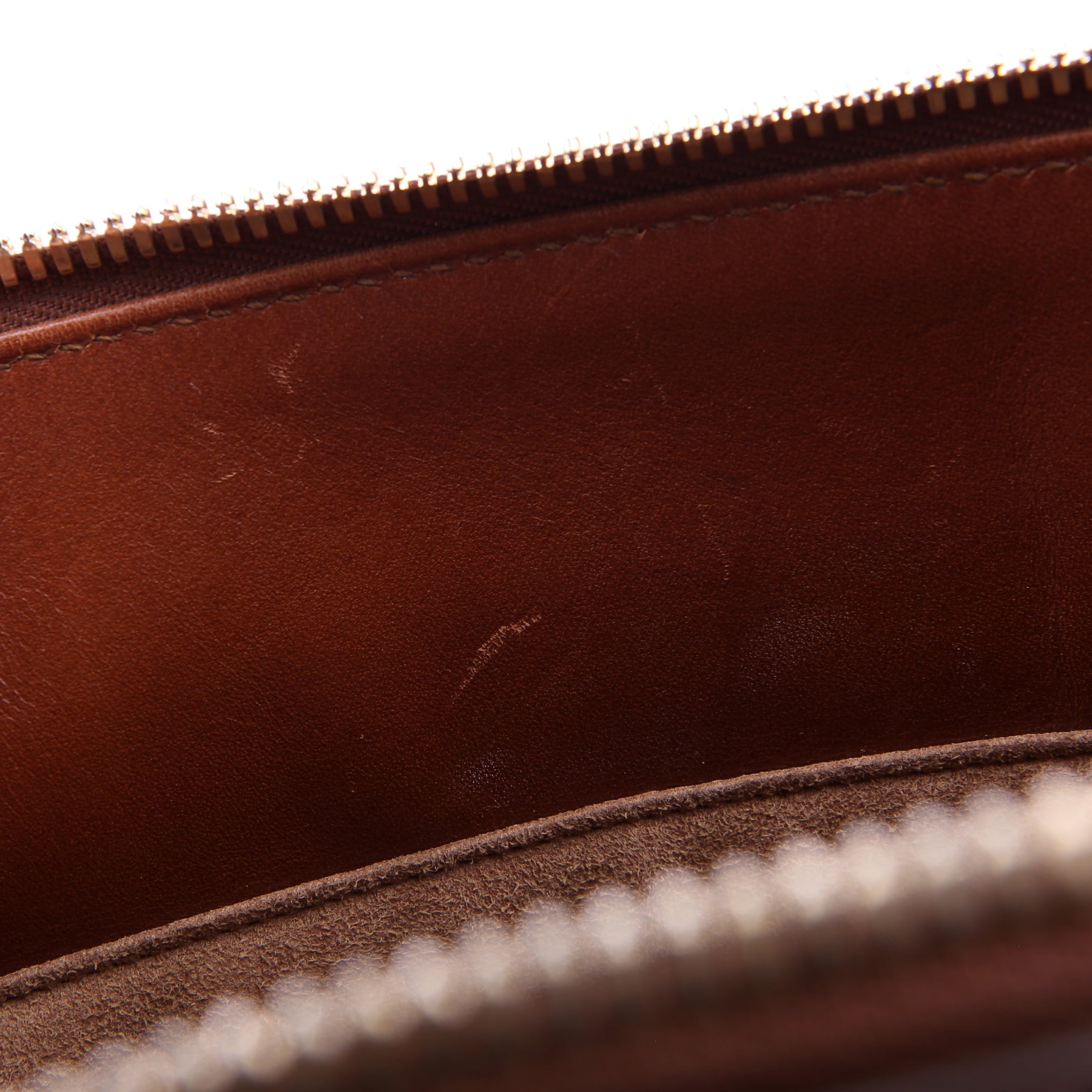 Interior: The interior is clean. The interior includes two open pockets and one zippered pocket. The leather has scuffs.