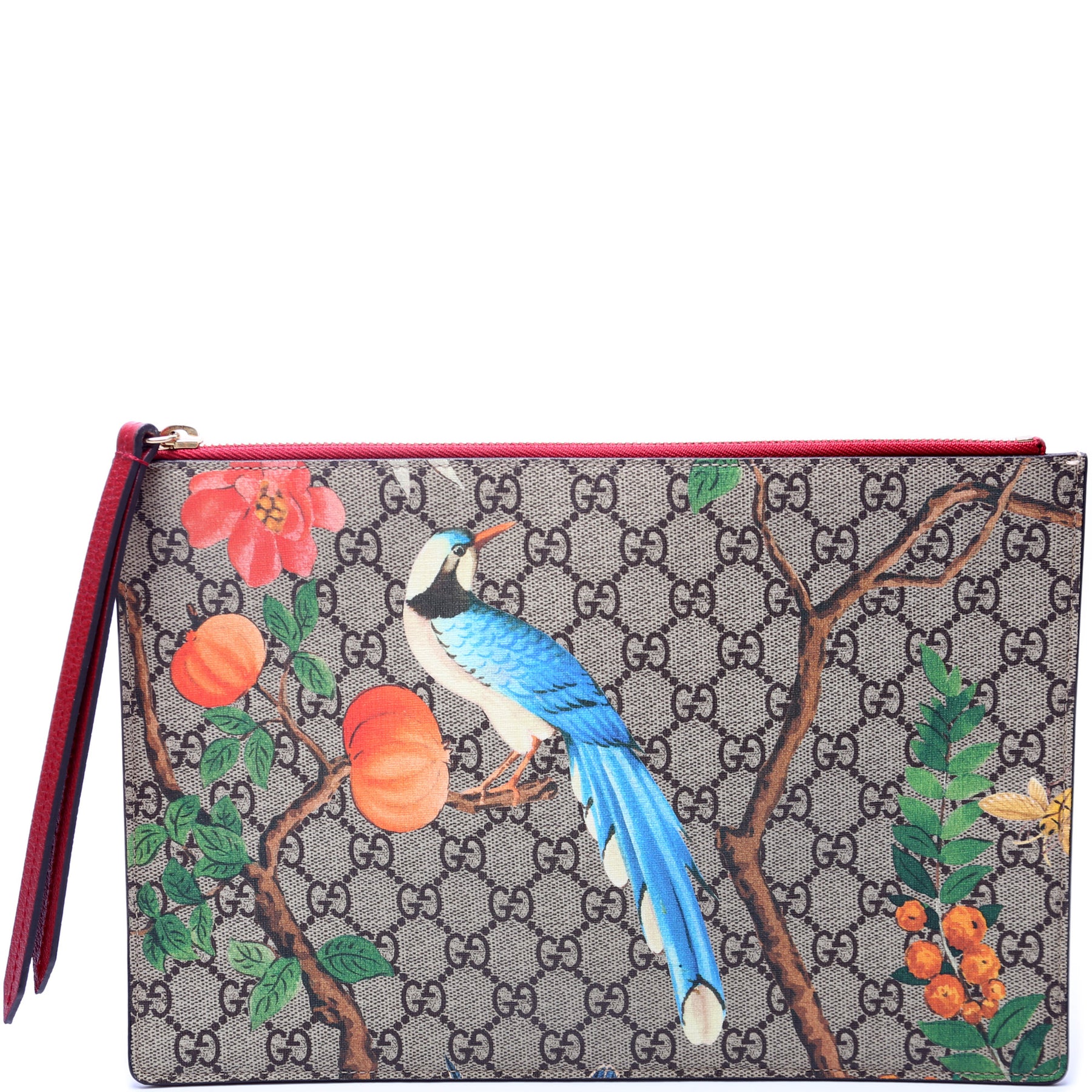 This pre-owned Gucci GG Supreme Tian Pouch is guaranteed 100% authentic. The exterior is in the classic Gucci GG Supreme coated canvas.